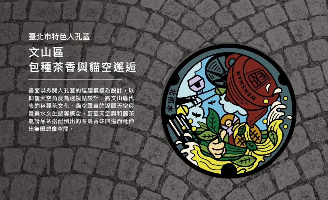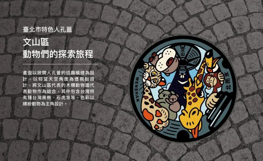 负责文山区特色人孔盖的林厚进设计师,选择以文山区的「木栅动物园」与「茶文化」为主题进行创作,将文山区木栅动物园内的可爱动物与猫空著名的茶文化呈现在人孔盖上,创作出两款不同特色的文山区人孔盖—「动物们的探索旅程」与「包种茶香与猫空邂逅」。