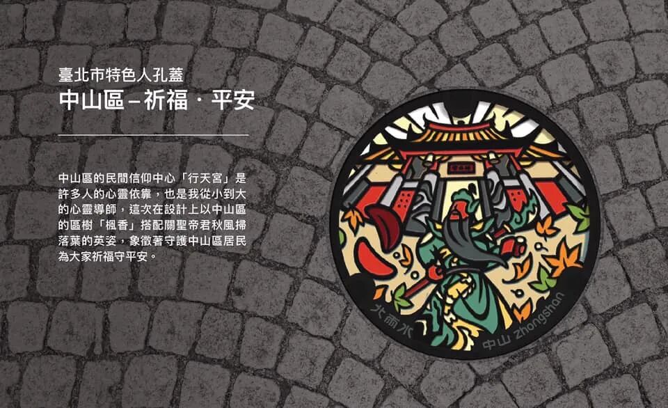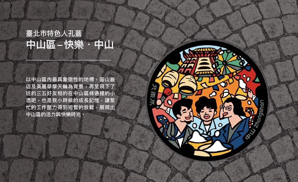 设计师吴介民选择以中山区的「人文历史」切入创作,把中山区的生活样貌与人文呈现在人孔盖上,创作出两款不同特色的中山区人孔盖—「快乐.中山」与「祈福.平安」。