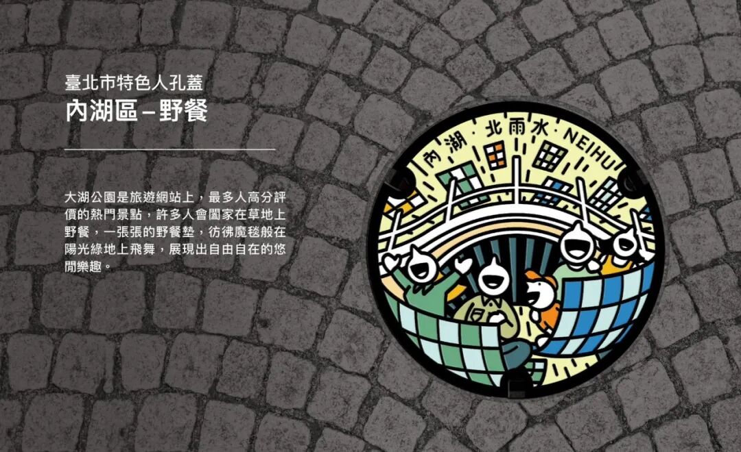 负责内湖区特色人孔盖的谢东霖设计师,选择以内湖区的「产业发展」与「自然景点」为主题进行创作,透过漫画手法呈现设计师眼中的內湖科技园区及大湖公园,创作出两款不同特色的内湖区人孔盖—「基地」与「野餐」。