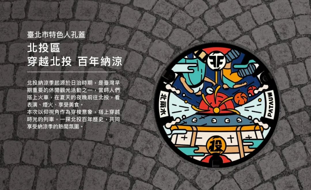 负责北投区特色人孔盖的张汉宁设计师,选择以北投区的「历史文化」为主题进行创作,透过纳凉季及温泉文化诉说北投区的历史过往,创作出两款不同特色的北投区人孔盖—「穿越北投百年纳凉」与「百年浴场北投狮吼」。