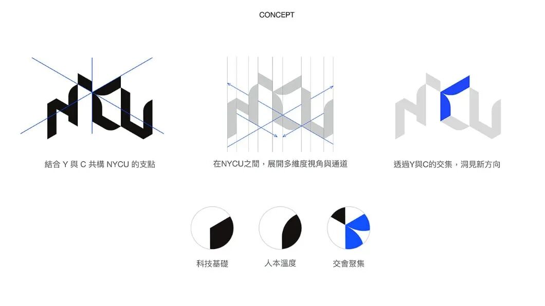 以与C共用的笔画支点代表合校的核心基础,展开一体多面的NYCU,共构出不同面向的门,隐含着不同方向的立体通道,象征各种可能性。