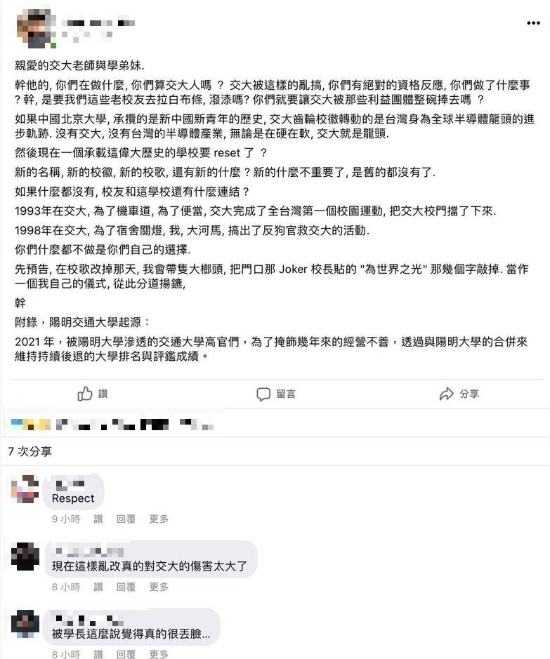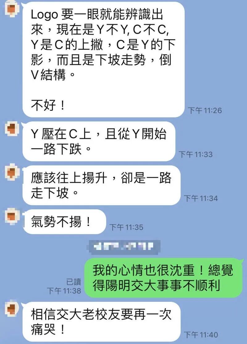 有的抨击Y不Y、C不C,既不阳明、也不交通,而且英文字母菱菱角角,甚至C往下,代表走下坡的趋势,更有交大人怒批,交大的C完全不见,被夹住后看不出交通的“C”字母,只看到阳明的“Y”,感觉阳明交通大学两校的缩写变成只有“NYU”,等于交通大学已“被消失”。