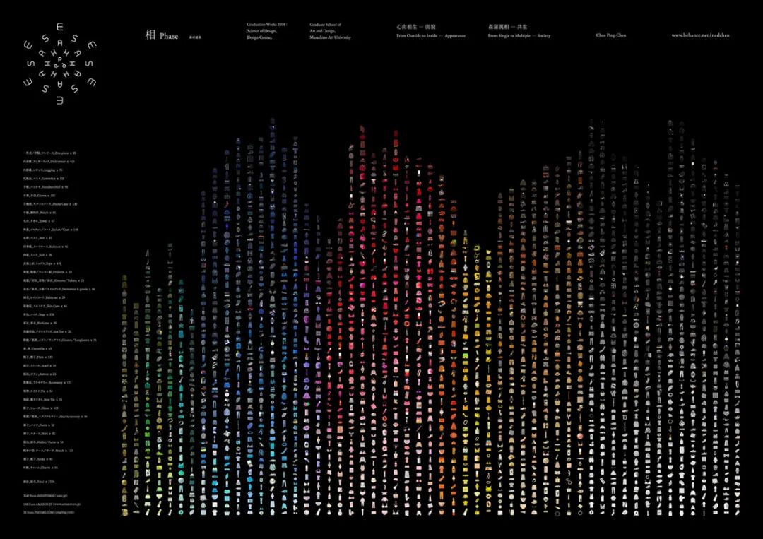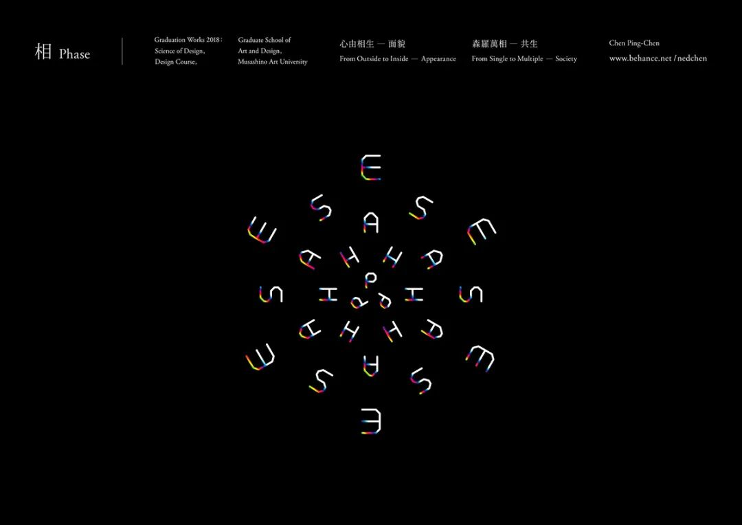陈品丞,1991年生于台湾省2018年于日本武藏野美术大学取得造形设计硕士学位自2014年起从事视觉设计接案工作作品曾获莫斯科金蜂平面设计双年展金蜂奖德国红点传达设计大奖最佳奖等逾60项国内外设计艺术奖项现任突形虫设计有限公司负责人亚洲大学视觉传达设计学系兼任讲师Ping Chen Chen Work 相 PHASE 人类,是极其複杂的综合体,在不同条件下能显现出不同面相,并且随时都在更新状态。因此,人类之间并不存在任何一套“正确的”标准或分类。 但在文化长期的演变之下,某些标准/分类成为了充满意识形态、难以动摇的“先决条件”,例如:性别。至今关于性别的分类早已不是“男”、“女”两个类别,但在生活中,我们仍有许多的思考被根深蒂固的二分法所制约。这令我对“性别”这样的抽象概念感到相当神奇,便开始在其脉络中研究一些约定俗成的符号。我将作品主题设定为“相”。“相”意指外在的面貌、行为看起来的状态。每个人的“相”,衣著、穿戴物应该是影响比例最高的因素,也是自我的一种投射。在我的作品中,我将每个穿戴物件视为性别符号的最小单位,这些物件便是不同集合内的元素。而物件即使相同、也会因不同组合产生不同结果。我在各大成衣销售网站上蒐集了3729个穿戴物件,透过不同的组合方式,试著在作品裡混合性别概念中不同集合间的“异中有同、同中有异”。 “相”作品分为两个部分,其一是“心由相生-面貌”,探讨单一个体中包含多少性别外在的既定印象,以及既定印象如何反过来构成、定义个体。我藉著销售网站上“男”、“女”的分类,取其穿戴物各组了“男”、“女”的面孔,再以各半的比例组了骷髅头,也就是性别再往前回推一个抽象的概念:人类(Human)。而在“森罗万相-共生”中,我著眼在群体的集合关係,以男、女各50套衣著(穿戴物件)象徵不同的人,制作了100株不同高矮、弯直、大小,像是植物的生命体。以大致的色彩进行10个分类,最终集合为一个多彩的光景。 我认为,狭义的性别框架不过是分类的一种,单一个体的身份认同(Identity)应有更多幽微、暧昧的可能性。如同教师/作家Ram Dass在《Self Judgment》中值得玩味的一段话:“当你走进森林裡,你看著树木,看见各种不同树木。有些弯曲、有些挺直,有些常绿、有些不知名。你看著树,你接受它。你看懂它为何是这模样。你大致了解它缺乏足够阳光,所以长成那样。你不会对它充满情绪,只是接受它,欣赏著树。当你一靠近人类,这些就都不见了。你不停地说:‘你太这样,或我太这样。’审判的脑袋进驻了。所以我会练习把人变成树。意思是,欣赏他们本来的模样。”森羅萬相-共生From Single to Multiple-Society 9th The Power of Asian Design“来自亚洲的设计力量”活动于2022年迈入第9届,每年度的活动视觉设计,均由16个圆连线的“亚”字、以及象徵”A”的向上三角标示构成。为求在同样的设计规则下,进一步开拓“来自亚洲的设计力量”活动形象的可能性,我们採取了有别于以往的表现策略。“山”在亚洲文化中蕴含了神圣智慧、登峰造极等正面积极的印象。而活动内讲师与学员之间的互动光景,就犹如板块碰撞形成的造山运动。我们以现代化的3D绘图技术,重新描绘一座古老山峰,配合抽象化“日夜”、“时钟”意象的几何渐层图形及萤光黄色的点缀,试图捕捉蕴藏在古老智慧中的崭新视野-即“来自亚洲的设计力量”。 INNOVATORS EXPOPersonal Works - Music Graphics愛的形狀我以磁铁的特性、颜色及组合,来传达彼此之间“吸引力”与“爱”的多样性以及可能性。除了创作“OPEN”及“LOVE”的字体外,磁铁彼此之间也像在互动-异性恋、同性恋、双性恋,热恋、冷战、寻觅对象,甚至单身贵族。然而这些词彙的分类,都可以是爱的样貌、爱的状态,并不存在正确与否。“爱”,存在无限的可能性。 2017 TAKU Award本届大古铁器设计大奖的主题为:“爱”。我以“徵求各种对于爱的诠释”为宣传比赛的核心,希望提供一个容纳不同理解空间的视觉设计。“爱”是一种无形的情感,可以被赋予在各种客观的物件上,因此除了大古企业本身的铸铁产品以外,我和花艺教室的老师合作,选用了“花”这个普遍认知和“爱”有所连结的物件。有趣的是,我们对于“铸铁”和“花”的想像截然不同,两者无论在本质上、外观上都看似毫不相关。而那些意象与意象之间的“中间值”(例如东方与西方、刚强与柔弱等),那不确定的、不可言说的、充满可能性的状态,我认为便是能够催生出“不同理解空间”的途径之一。若你将他们视为“有生命的铁器”-那麽他们的状态也许是灌溉、也许是庇护、也许是对话,一切延伸的思考都取决于参赛者“如何去理解”。然而“如何理解”,便是参赛者“如何诠释”的关键之匙。2016 TAKU Award IP/I-I/-\I_I_F_VI 2017年3月,纸上太空展”。每位创作者需以指定的纸材及题目进行创作。我分配到的是主办方东玖纸业名为“采漾纸”的新印刷用纸,题目则是“哈雷彗星”。严格来说,“哈雷彗星”是个“已知”的资料,但这个“已知”却离我非常遥远,远到即便掌握了许多data,对于哈雷彗星仍有像“未知”一样庞大的想像空间。也许自然万物皆是如此,越是了解、就越会感到神秘。在创作时我的企图心降到了最低。在我从资料中理出一些具体的想像以后,便几近全然地忠于自我的