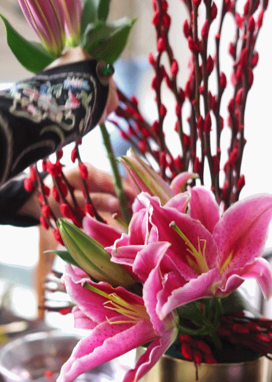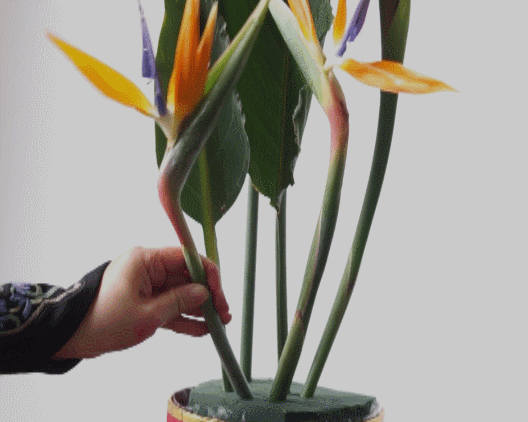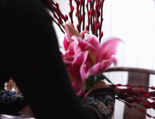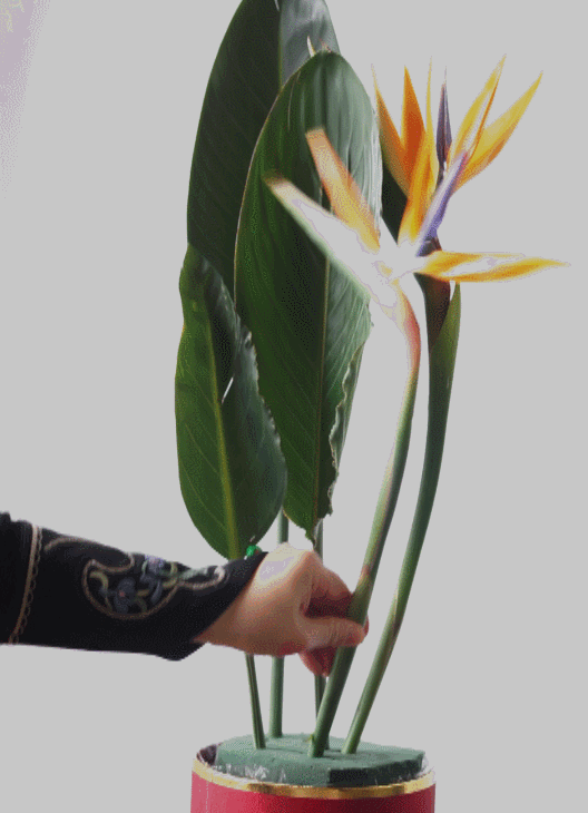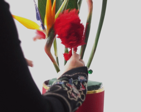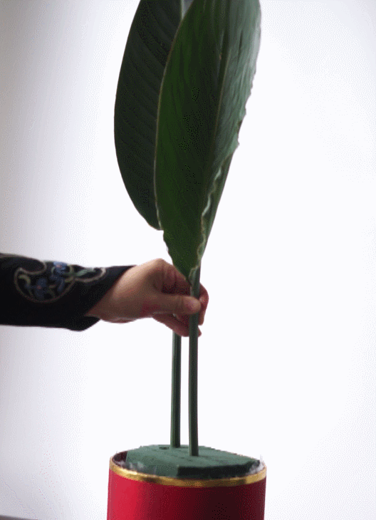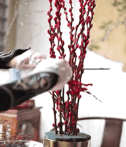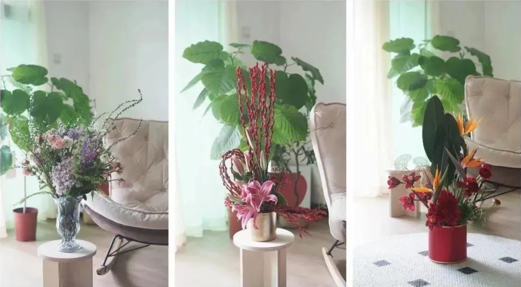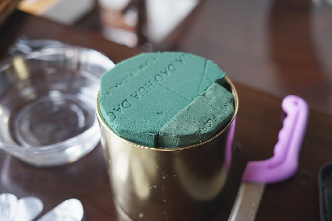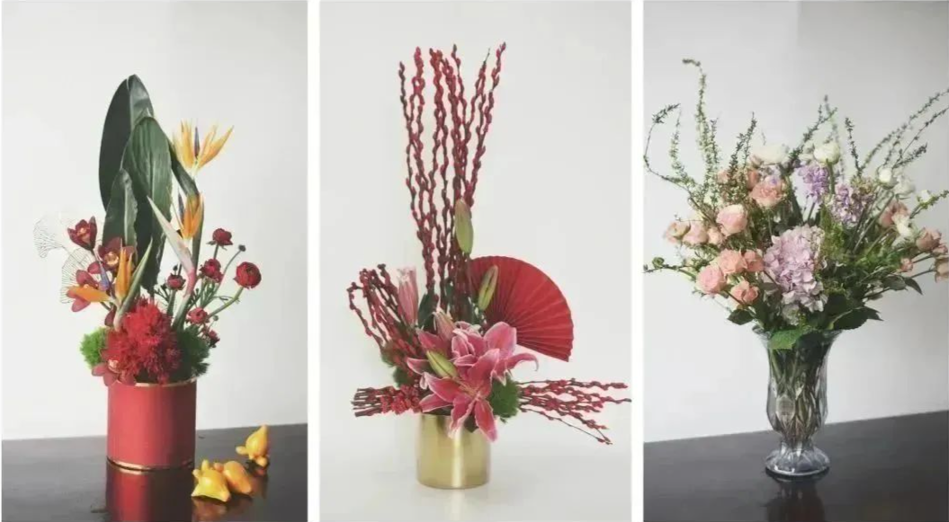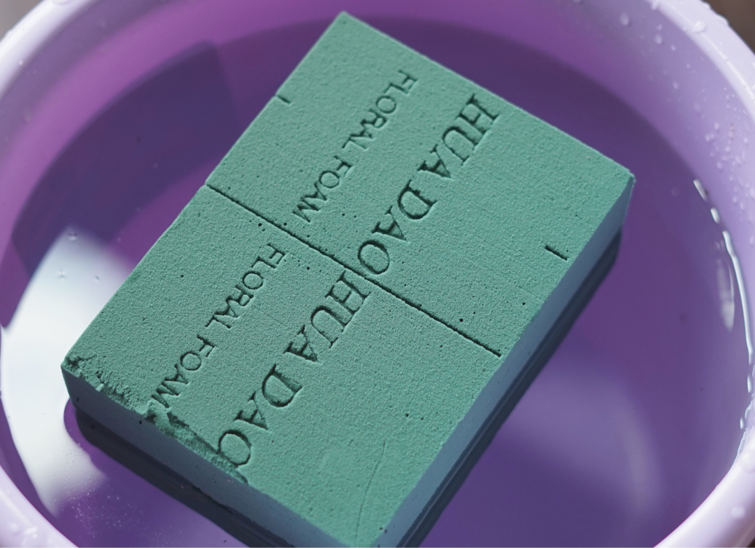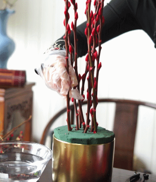 3、插好的花需要保鲜,才能从初一开到初七,花泥一开始已经吸满了水,三四天后再往里面加一点水补充即可,水插的话,可以提前往水里加一包可利鲜。