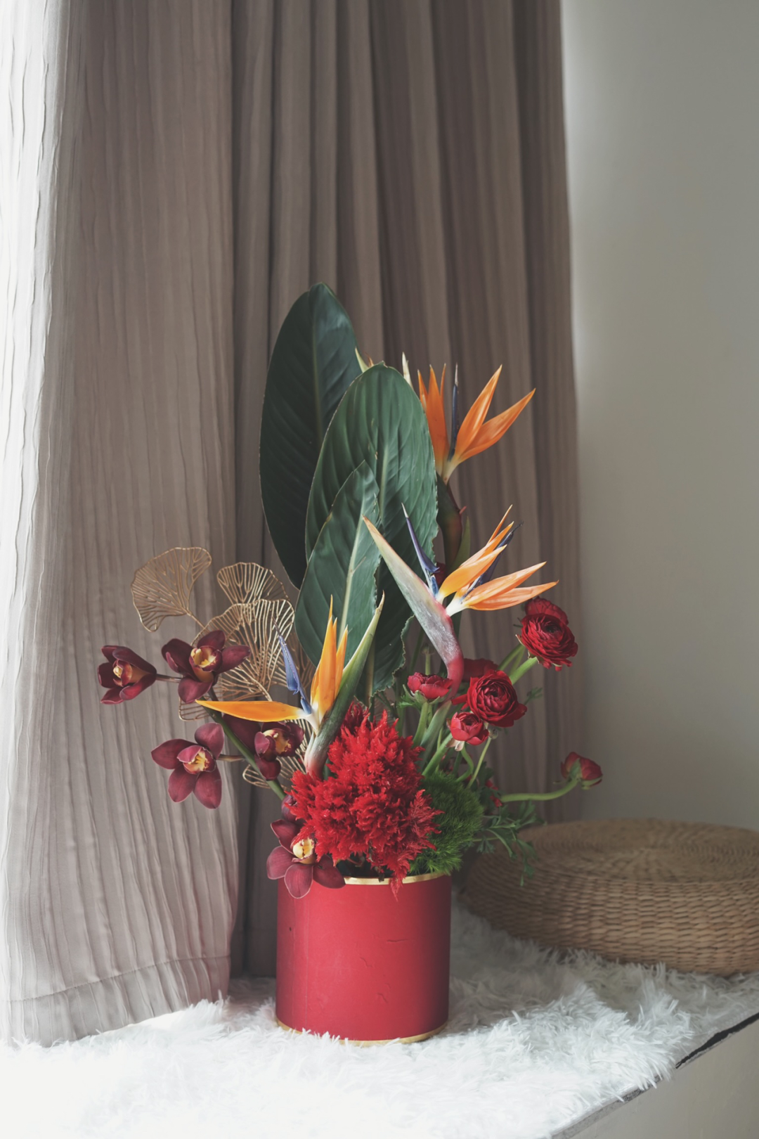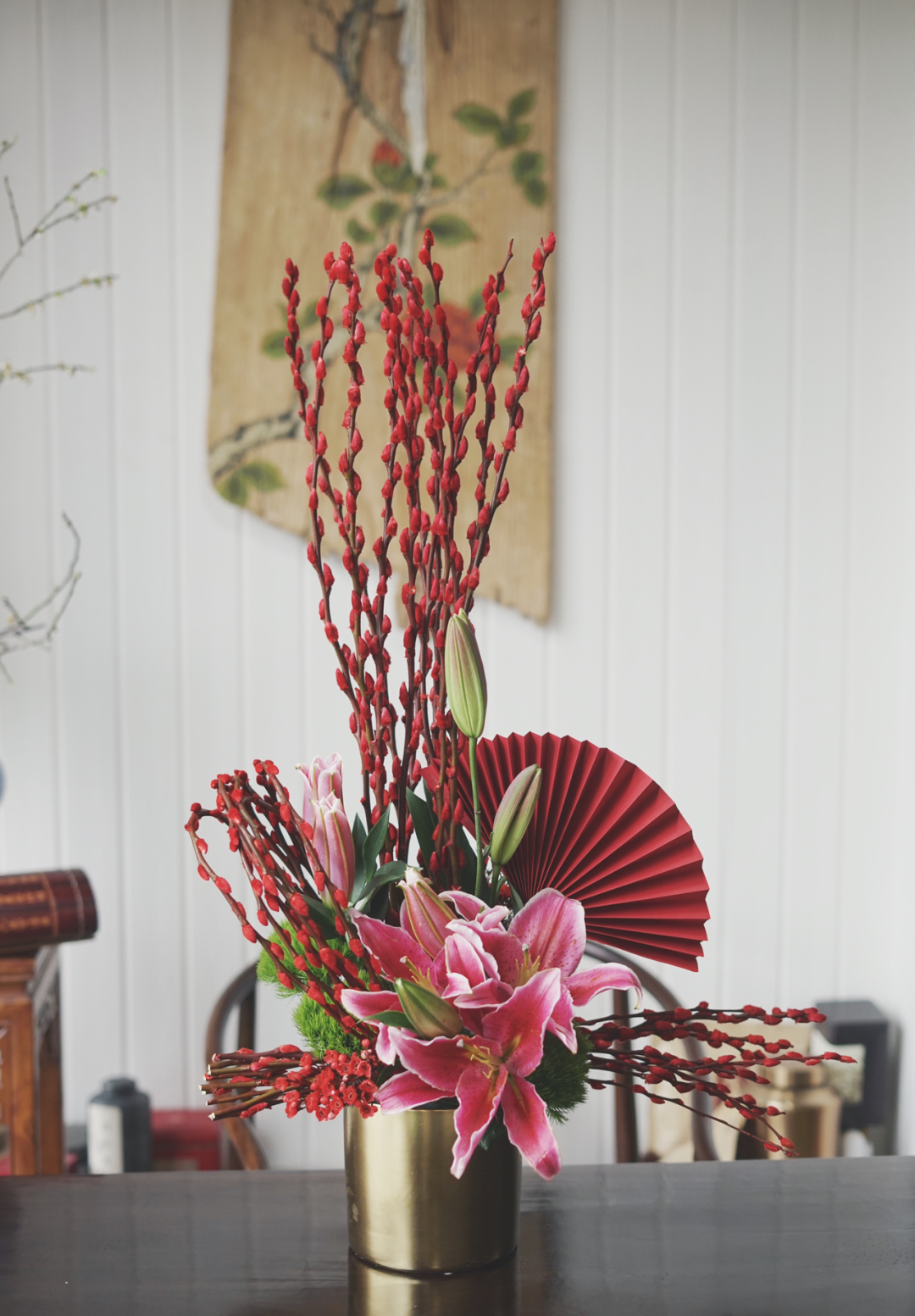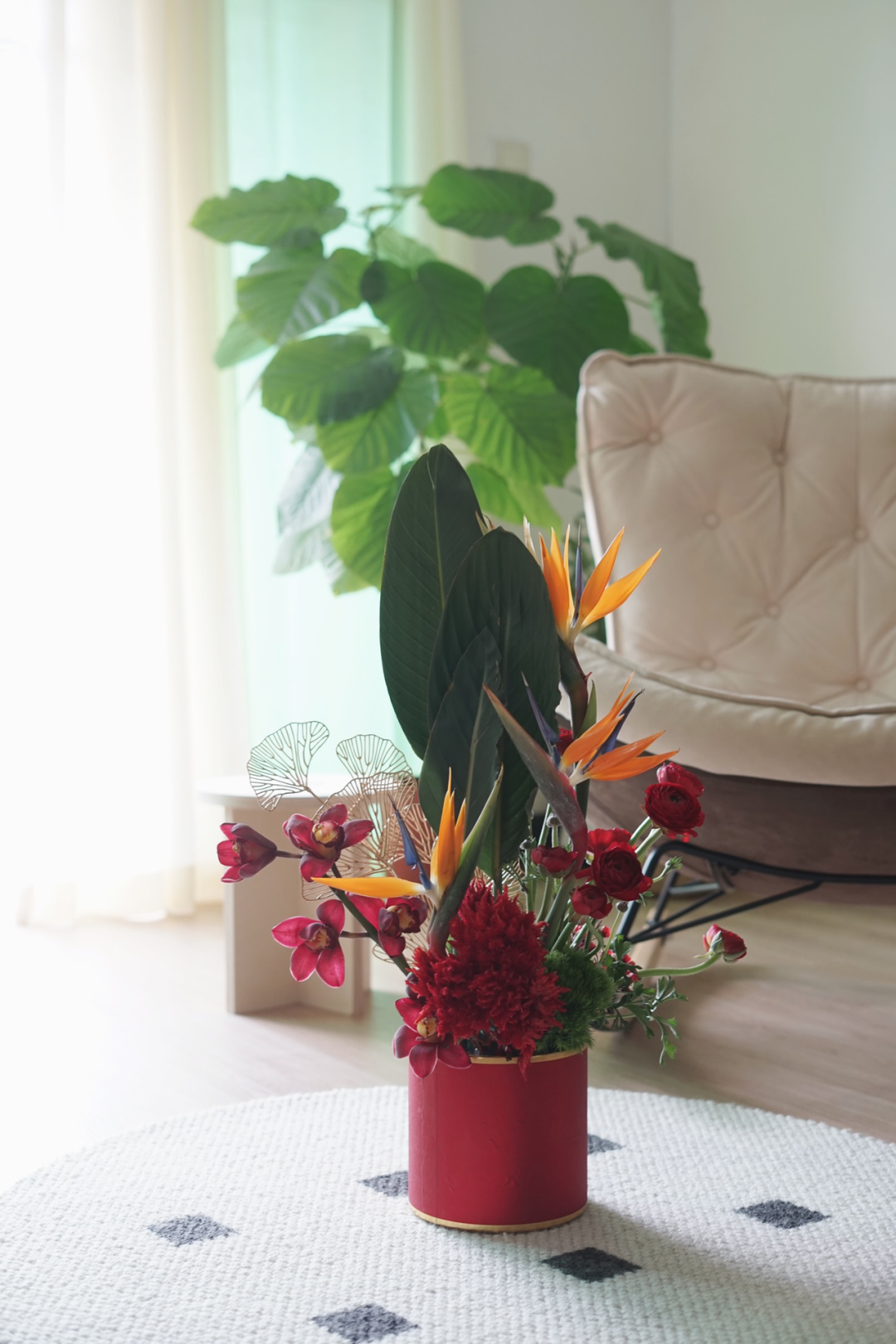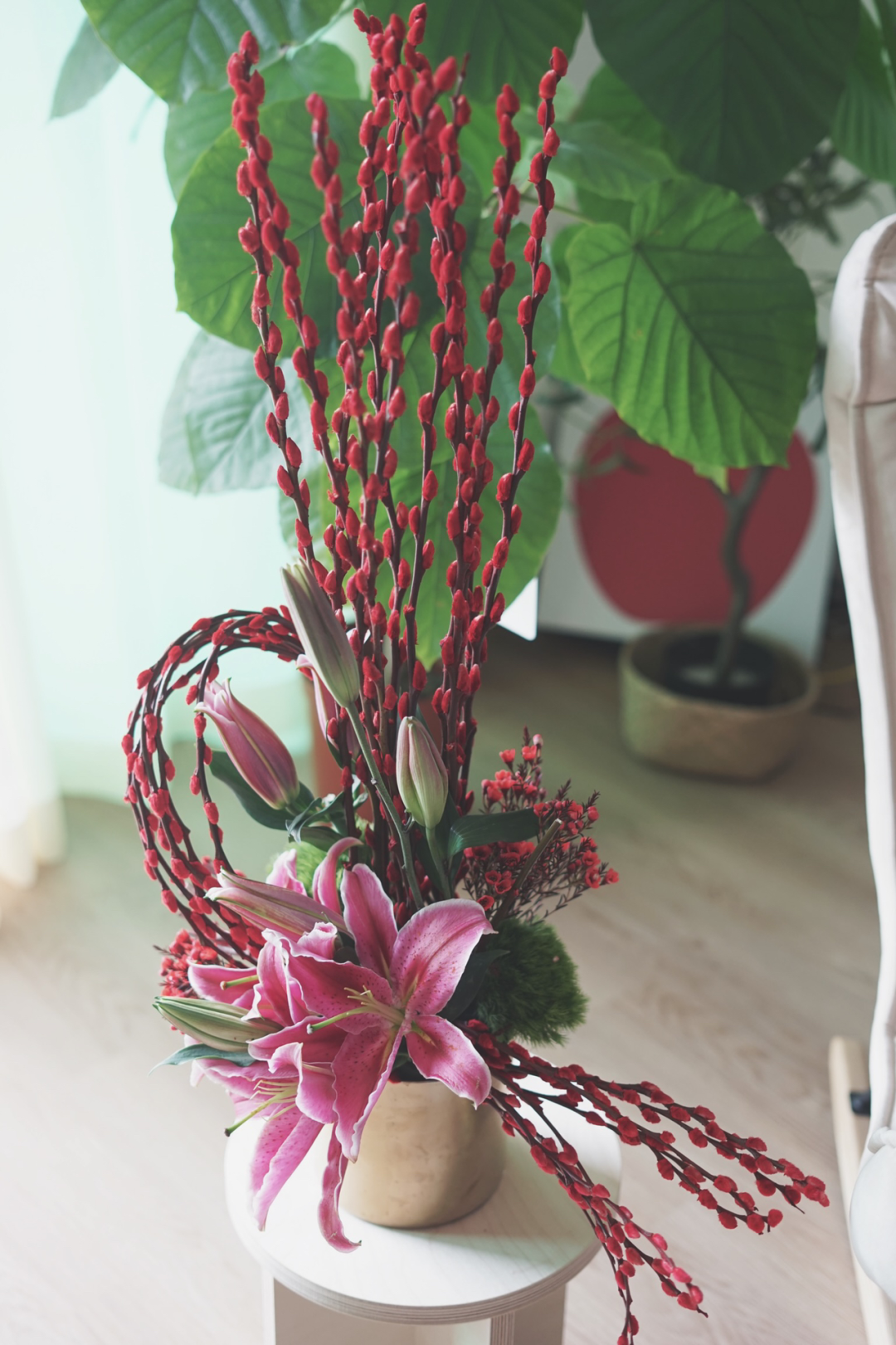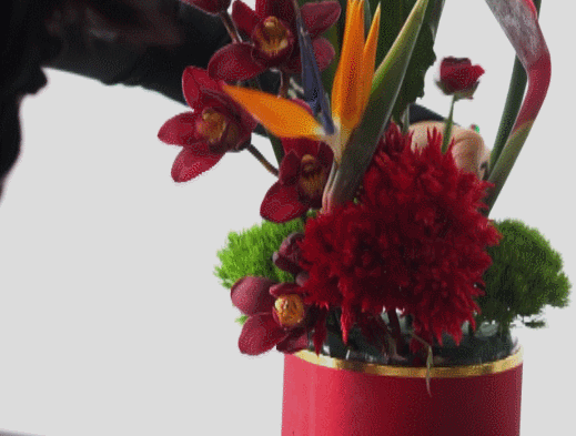 3、插好的花需要保鲜,才能从初一开到初七,花泥一开始已经吸满了水,三四天后再往里面加一点水补充即可,水插的话,可以提前往水里加一包可利鲜。