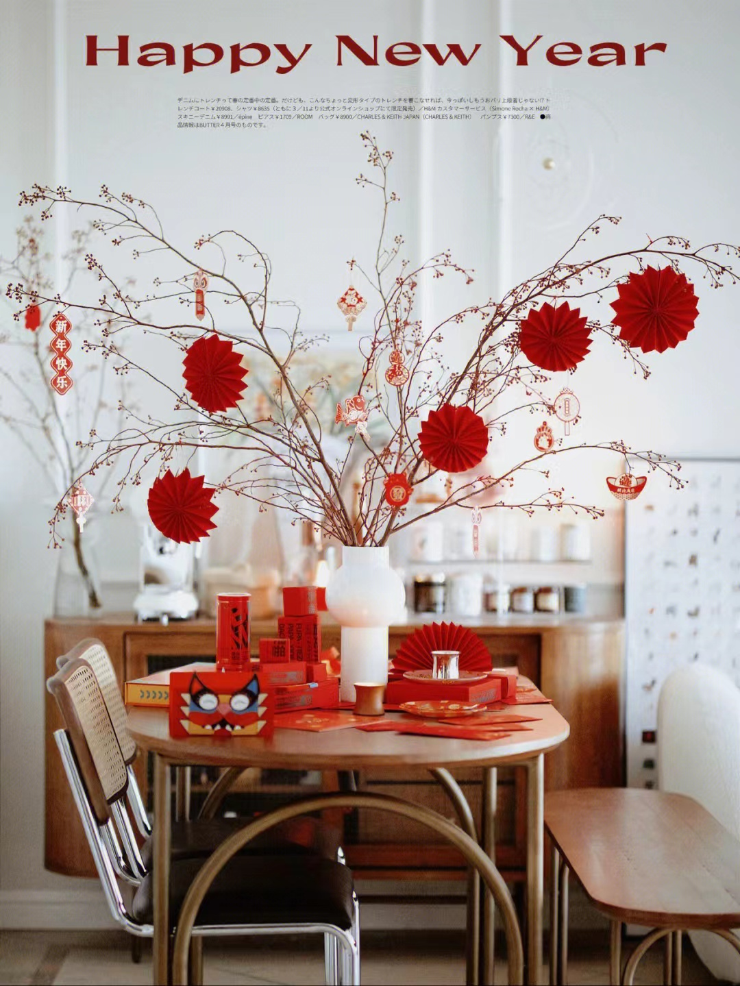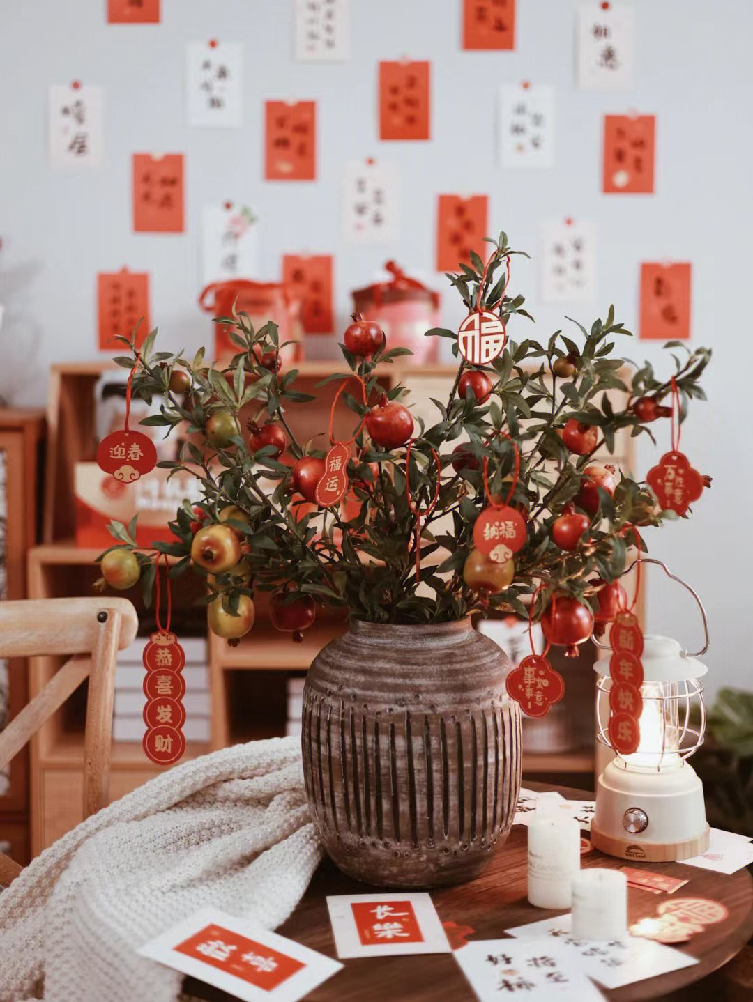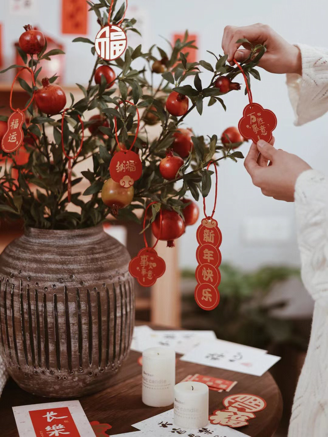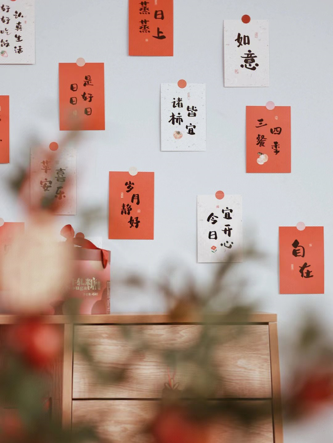 再适当挂上一些小卡片,买卡片的时候要注意看字体设计,好看的字体不会显得土气,喜庆又高级。