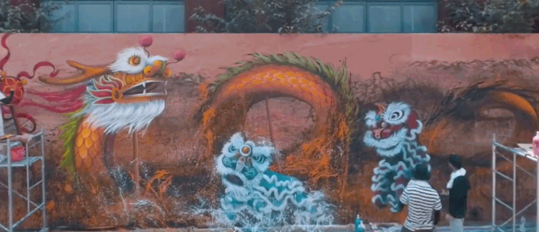 两头怒目圆瞪的大狮子,一条长达百米的巨龙盘旋其中,远处是青山和大鼓,青山、巨龙、舞狮,层层绘于墙面之上,超有立体感。