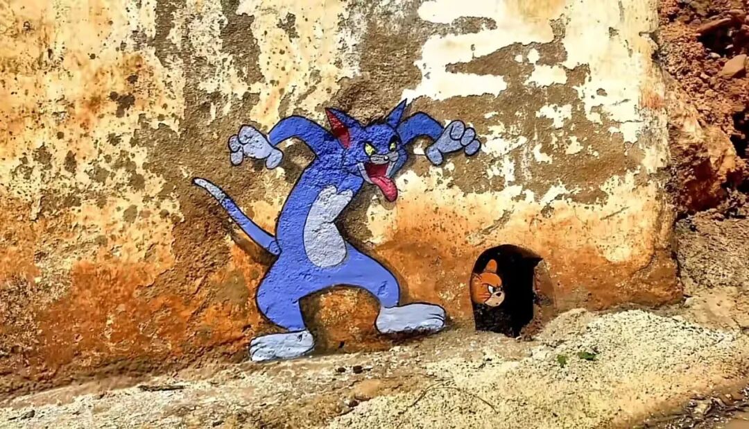 刘志诚的墙绘并不是孤立的,而是与周围的环境融为一体,这只黑暗中的小动物在偷偷看着你呢。