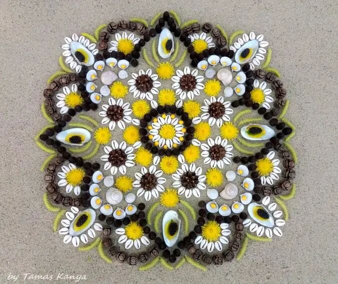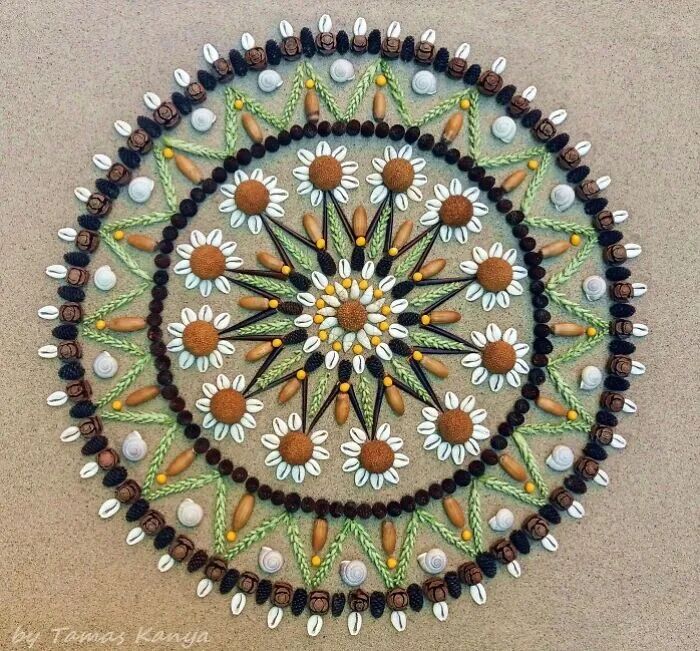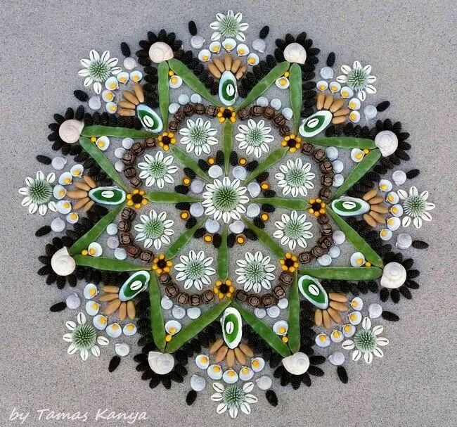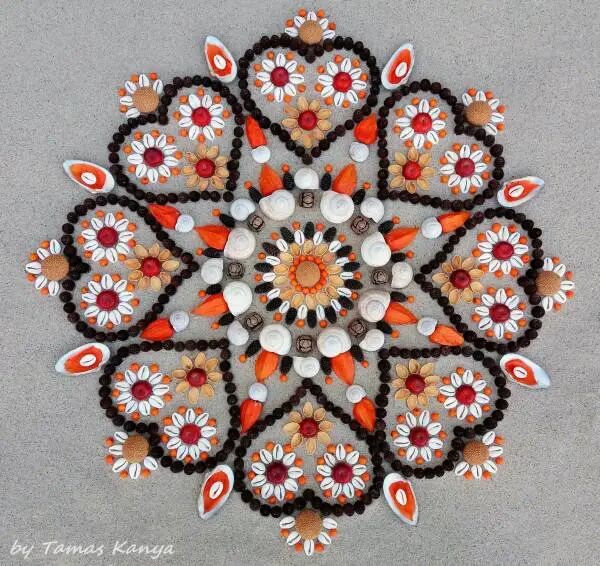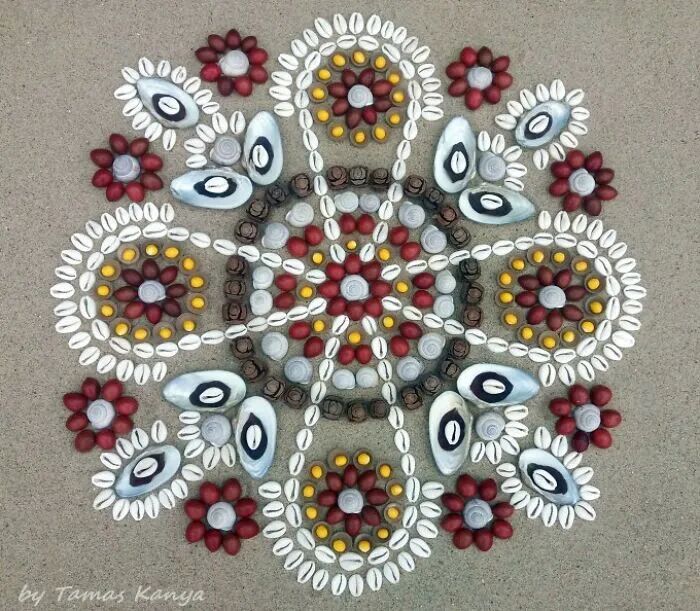 塔马斯·卡尼亚的创作场地通常选在空旷的海滩,他的作品大多是几何形态的精美图案,不要以为,这样的一幅作品随意拼一拼便能很好看,需要艺术家对设计、色彩以及对称、留白等有着独特的审美能力和敏锐的观察能力。既要突出重点,还要留足空间,既要对称,有时还要适时打破对称。