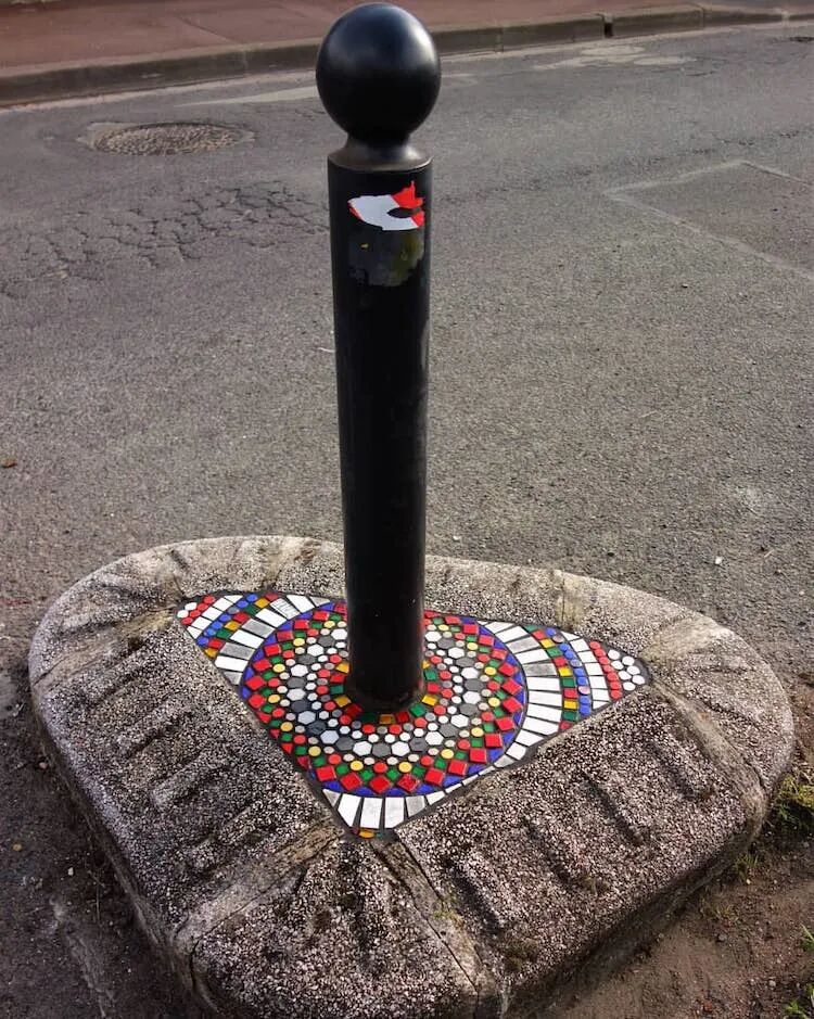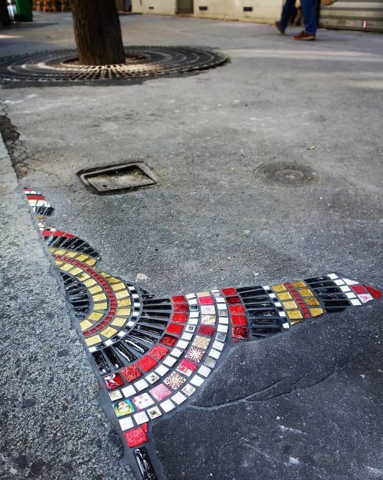 埃梅姆并不会去强行改变坑洼和空隙的形状,而是根据周围的环境,去设计图案的色彩搭配。最终呈现出的,是最原始的样子与马赛克艺术的结合。