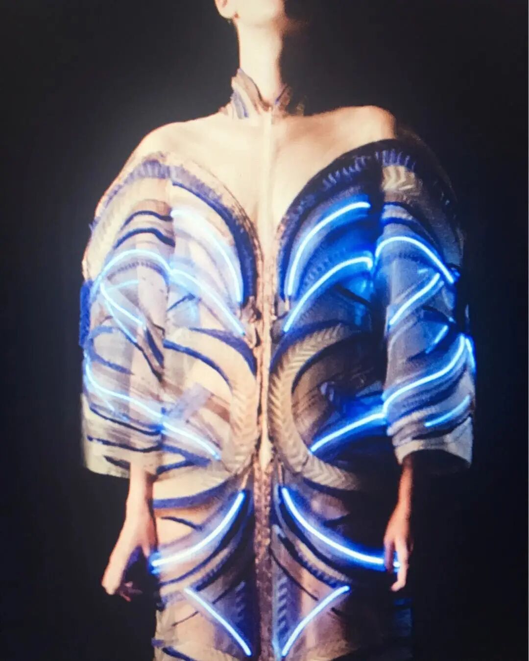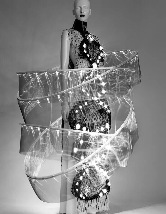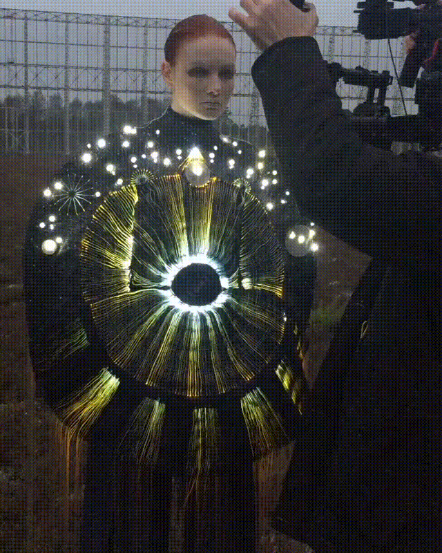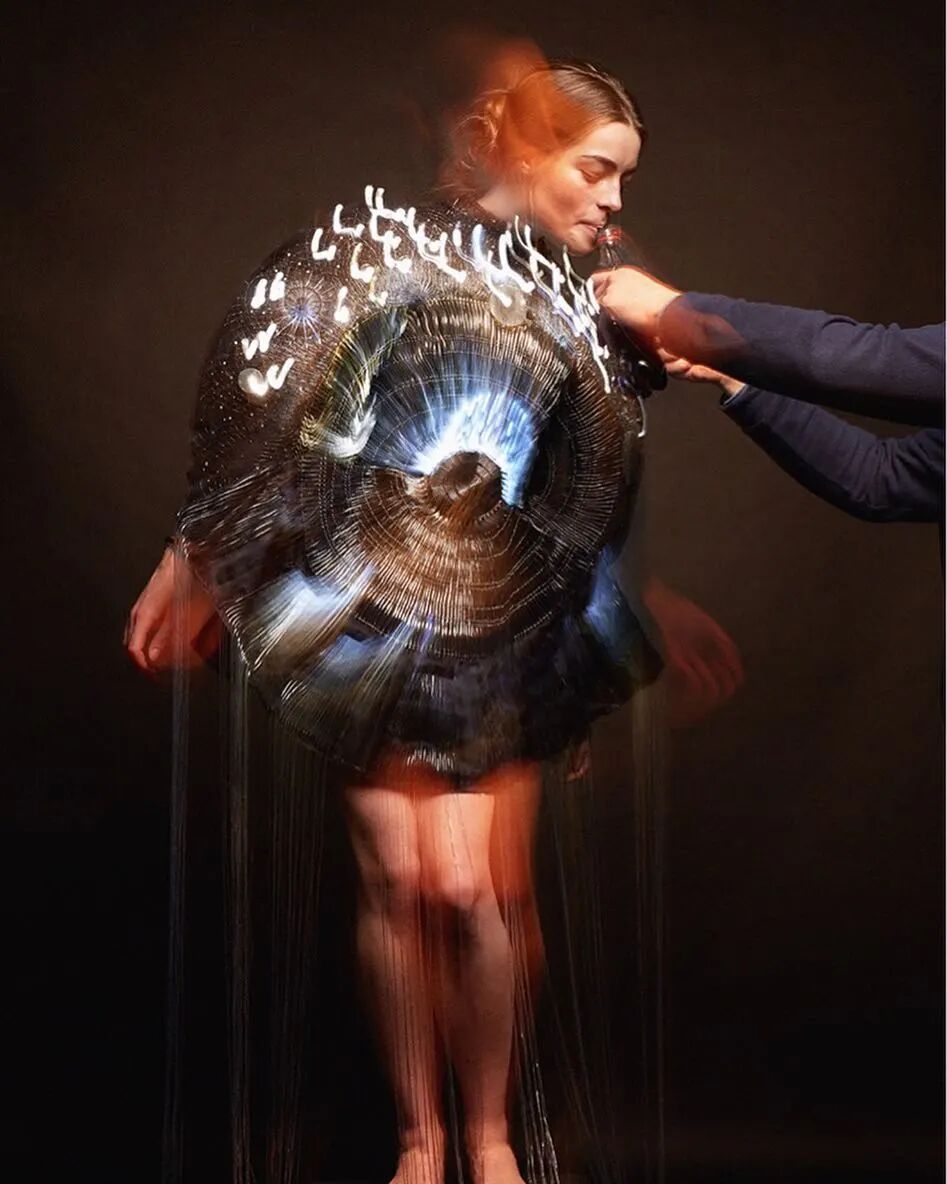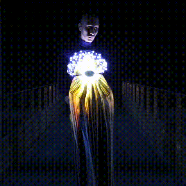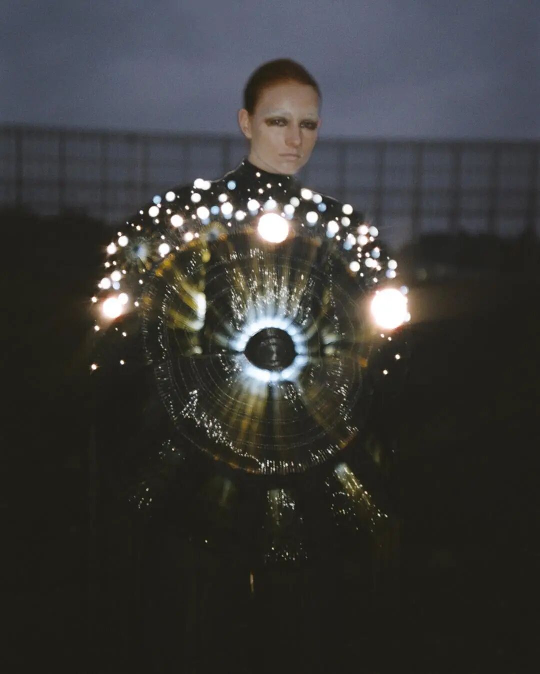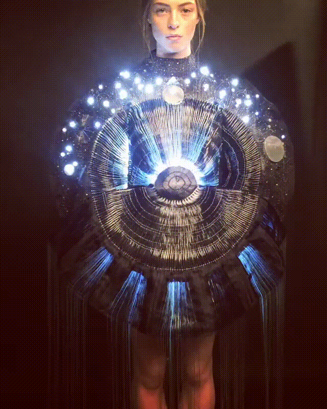 使用时尚作为媒介,可以让人类的身体在技术不断发展的关系中发挥核心作用。同时,"光"的作用唤起了Clara Daguin 无限的灵感概念,她从中获得启发,并以人体与服装之间的交互实验作为着力点,创作了充满未来概念的科技时装艺术作品。
