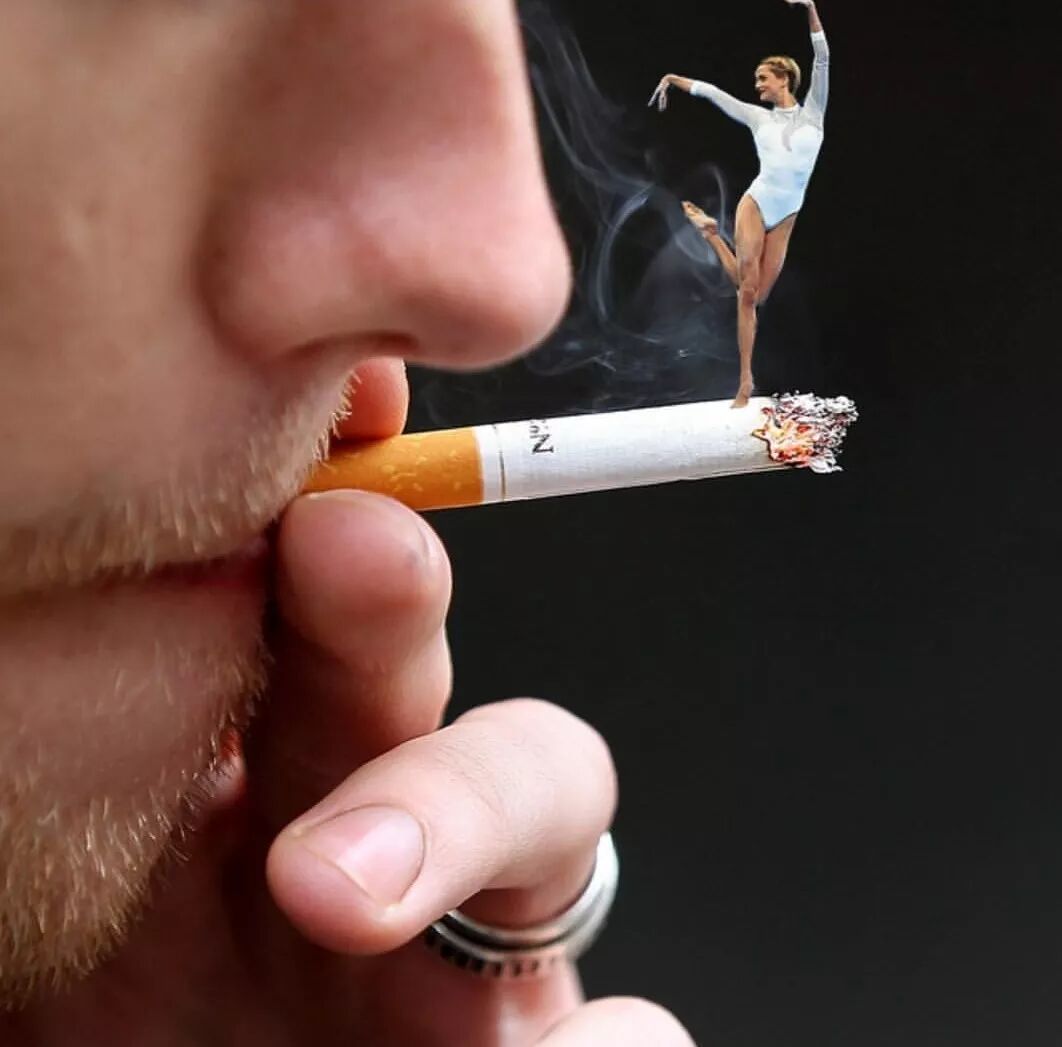 让小人在女人点燃的烟上好奇张望,