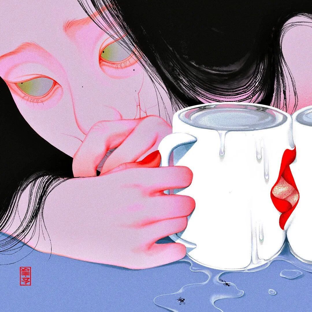 SilllDA说,在自己的房间里会摆着一个大大的书柜,在她灵感枯竭的时候,她会呆在房间看一天的书。可能正是因为着迷于各种奇闻异事,日本都市传说等,SilllDA所创作出来的画面也异于常人。