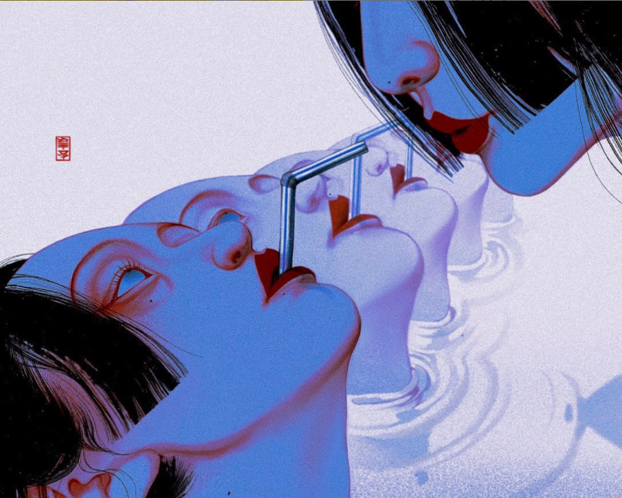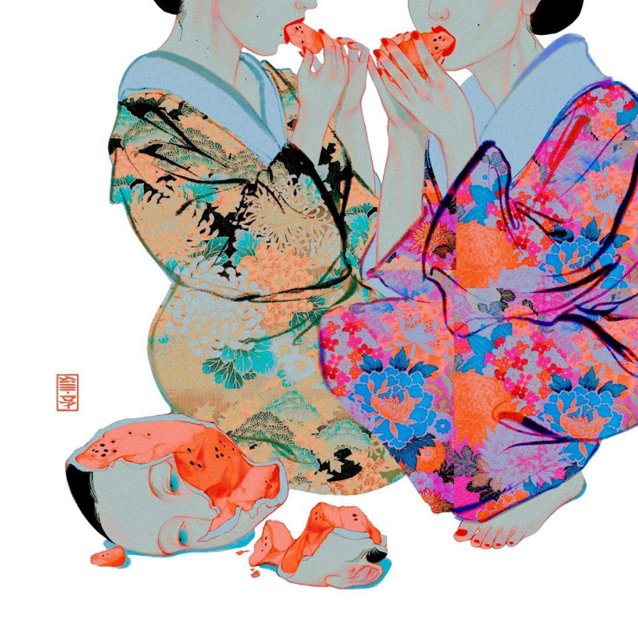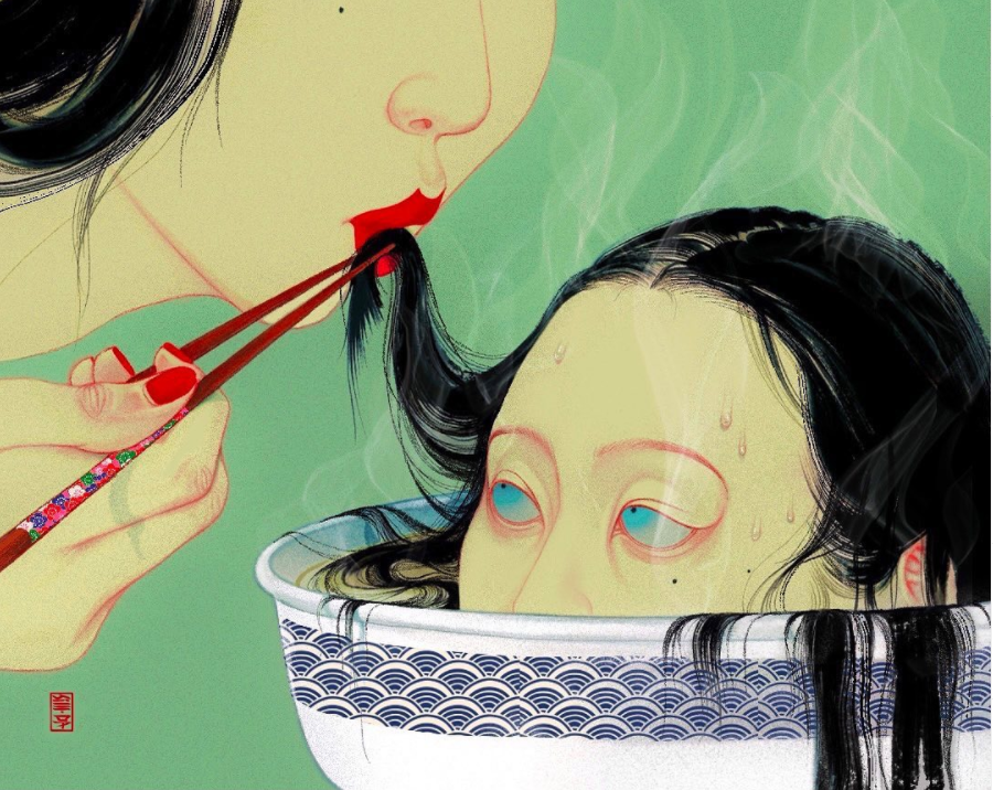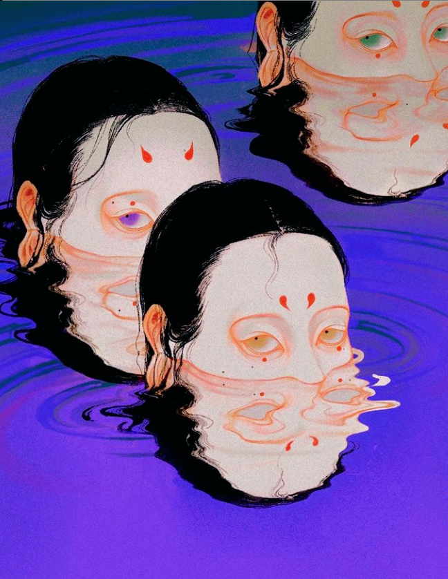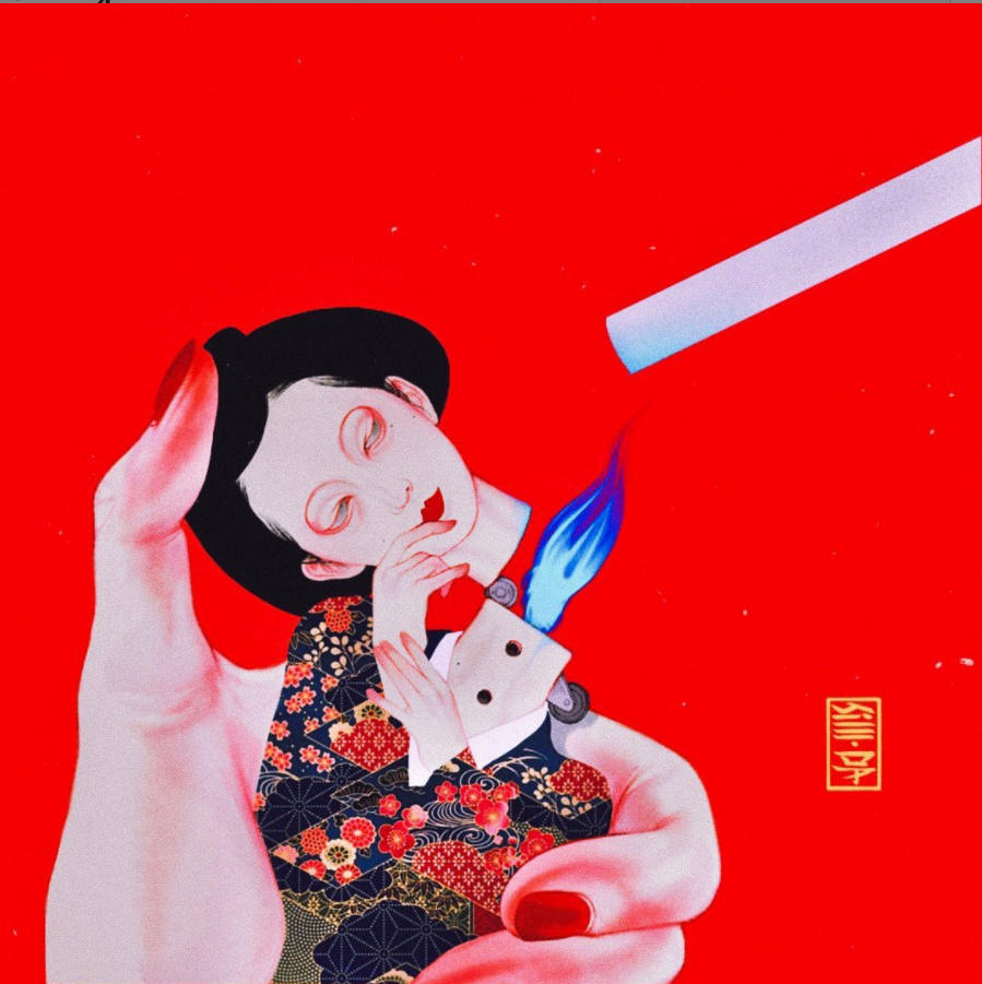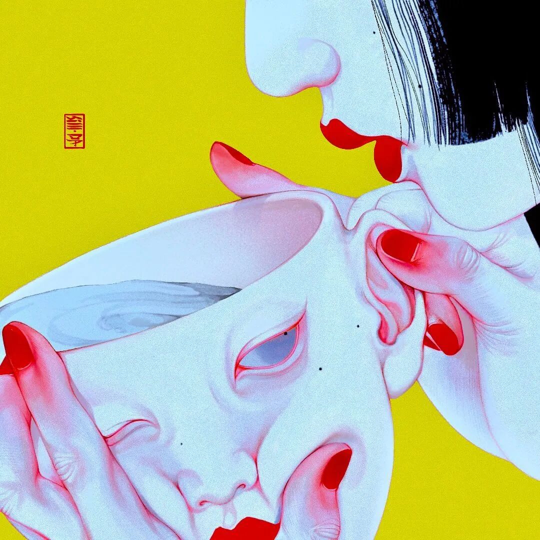 细看你还会发现,画中露出部分面孔的少女,就是SilllDA参照了自己为原型描绘的。这些黑色长发的魅惑少女,如妖怪一样妩媚婀娜扭动,身上穿着的服饰,又有点像日本浮世绘里妖怪的影子。