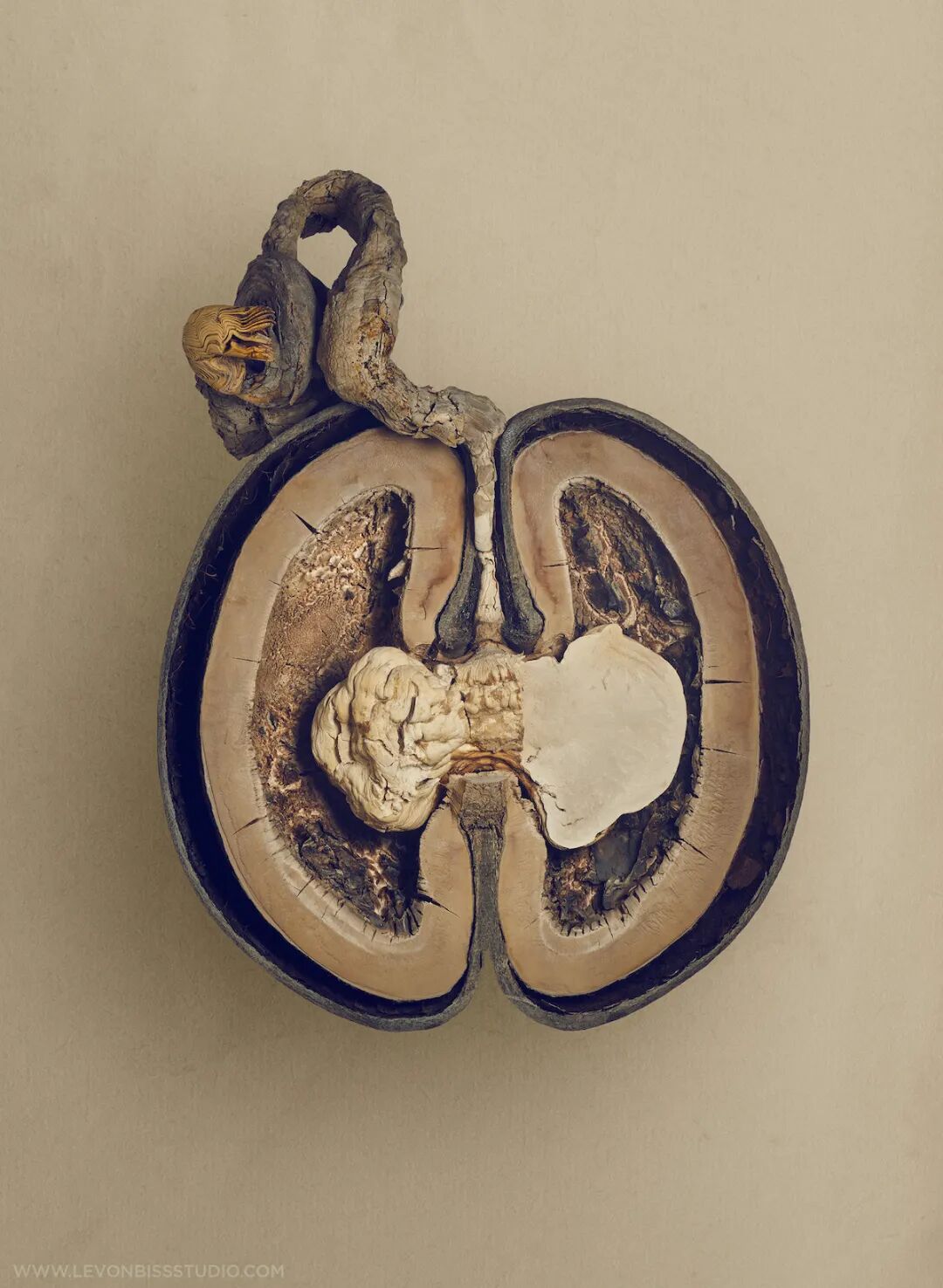 列文·比斯一直对那些小而结构复杂的东西十分着迷,之所以创作这一系列作品,也是无意中得来的灵感,有一天他在处理一只牛油果的时候,发现牛油果的果核,图案复杂精致,好像一个精心雕刻的雕塑一般。于是,他开始尝试将这些不易被人重视的美丽拍摄下来,让人们去感受生活中忽视的美。