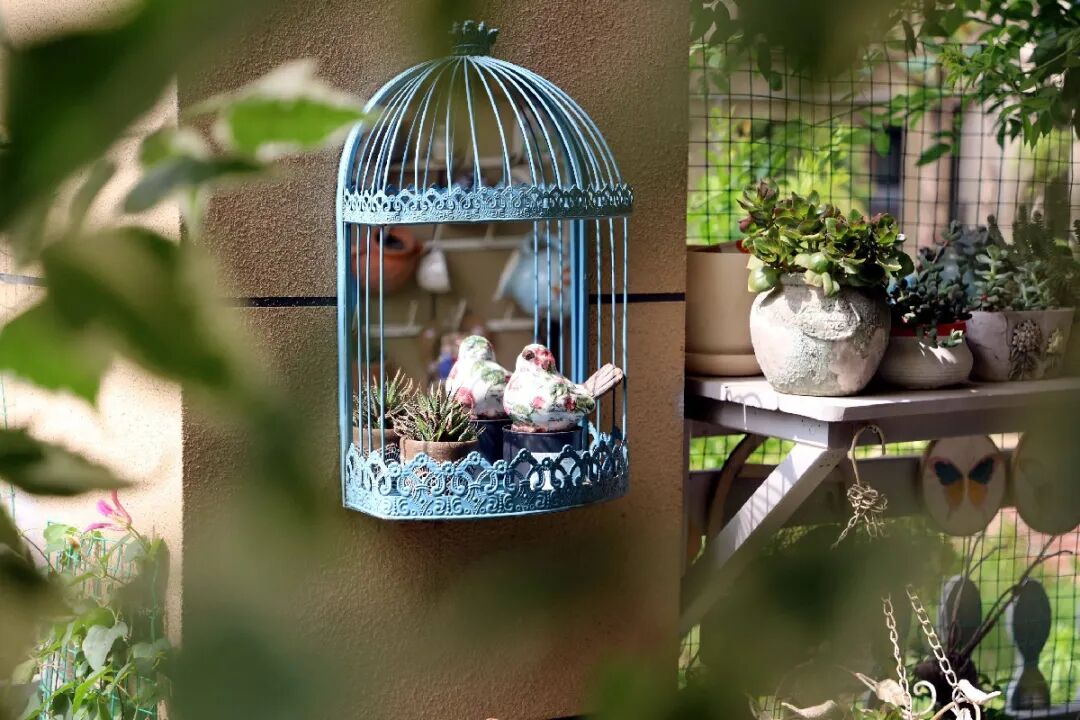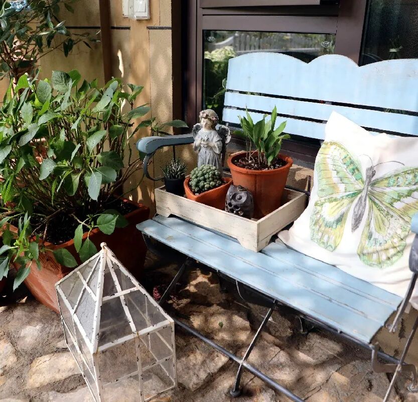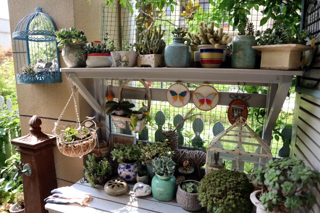 储藏柜和操作台与栅栏是一个色调,操作台其实也是展示柜,上面摆放着两排可爱的肉肉,每一个花盆都精致且不重样,还挂着韦莉精挑细选的一些装饰品:风灯、青蛙挂件、自己亲手绣的蝴蝶、家中保存了四五十年的小镜子等等。