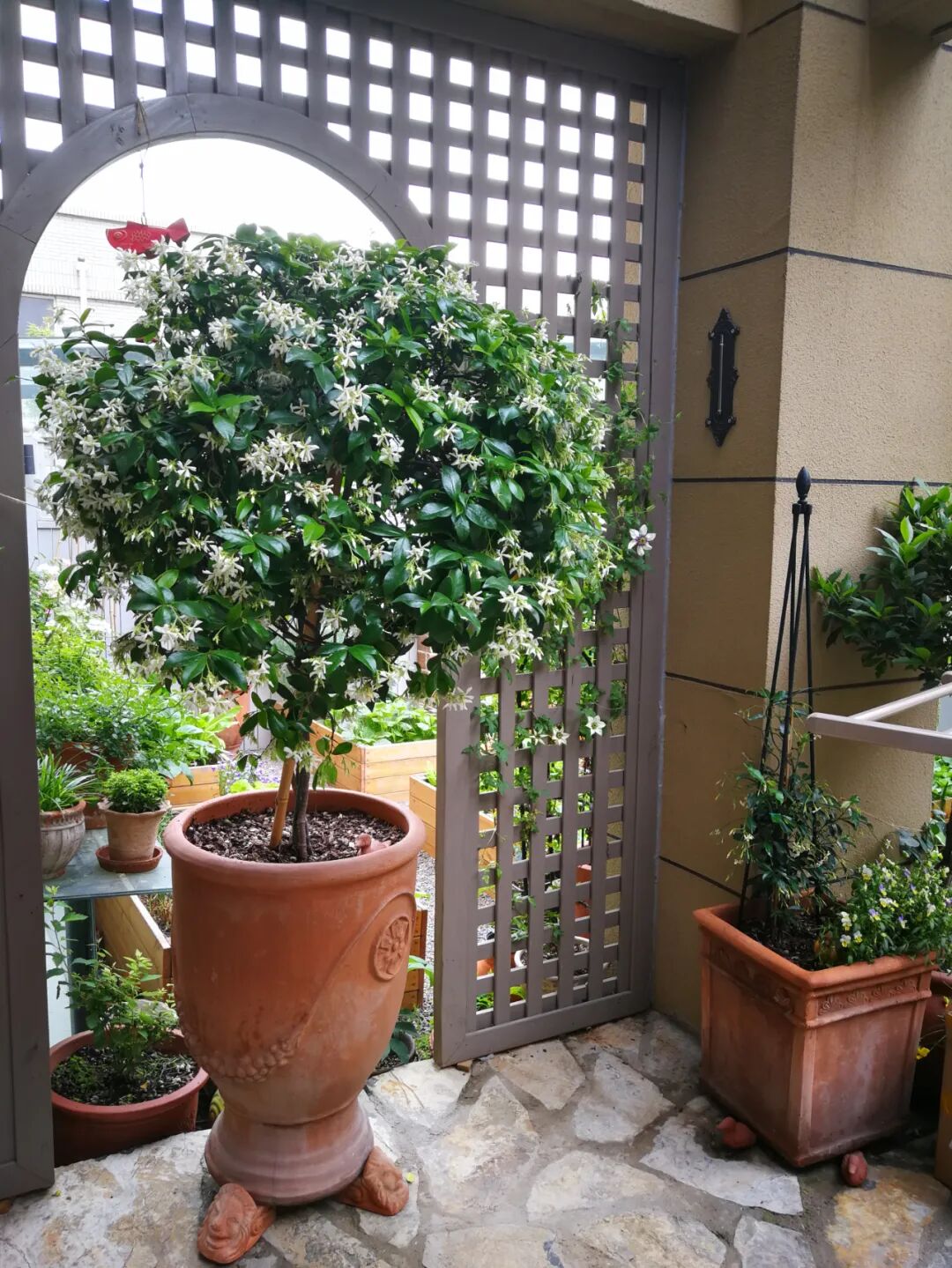 每一处景、每一盆花都凝结着主人的心血。刚过花季的风车茉莉栽种在一个大花盆里,形状像一颗棒棒糖。这是韦莉花了两年时间精心“盘”出来的造型,那时候棒棒糖造型的花还不像现在很容易买到;一盆开得正艳的风雨兰已经养了20多年,那是父亲以前送给韦莉的,越是雨后开得越好,经过亲情的浇灌历久弥坚。每天,韦莉都要在花园忙碌一两个小时,浇水、捉虫、修剪、施肥,样样都是体力活。好在她在地上铺了隔草布,省去了除草这项工作。
