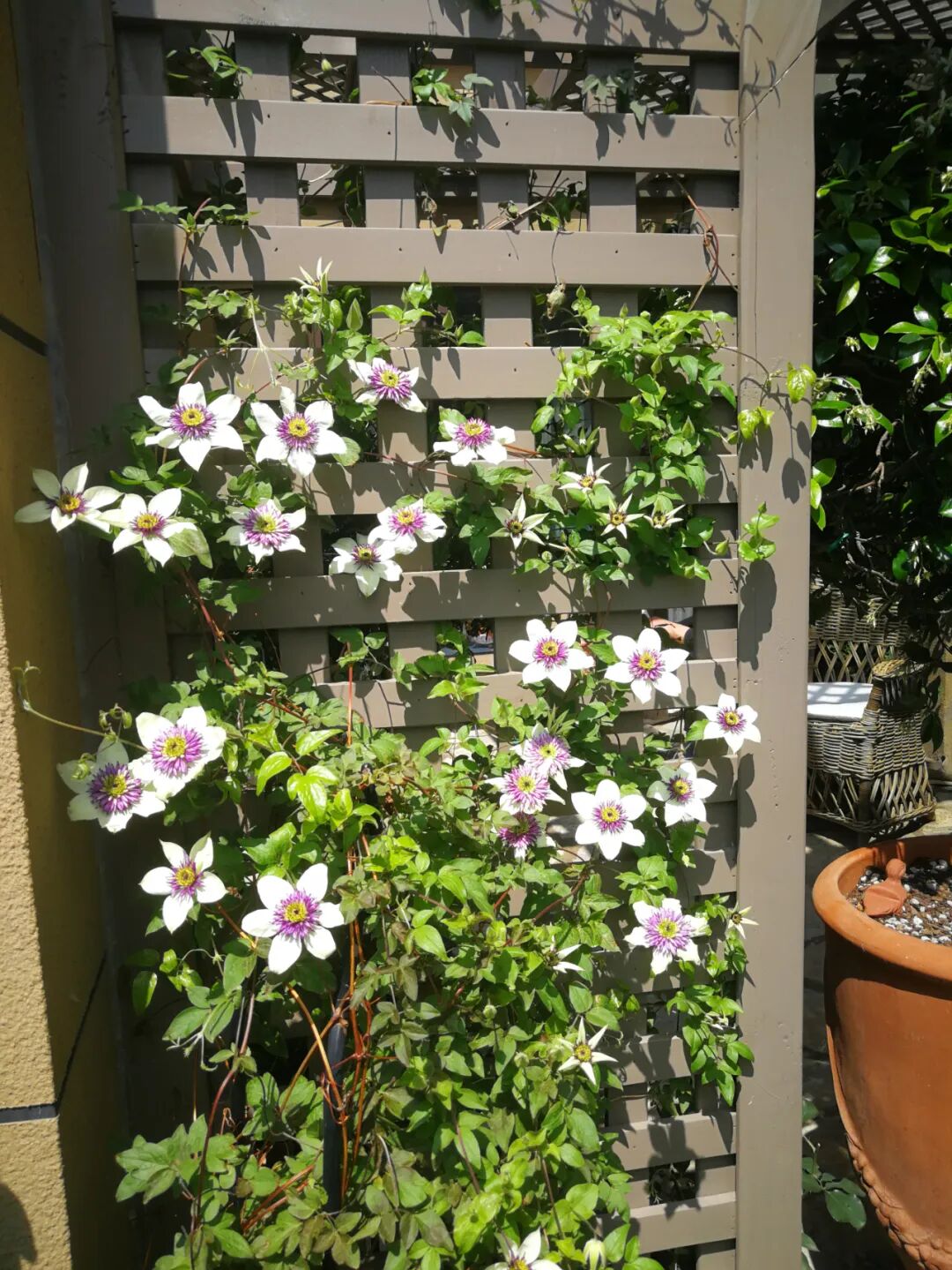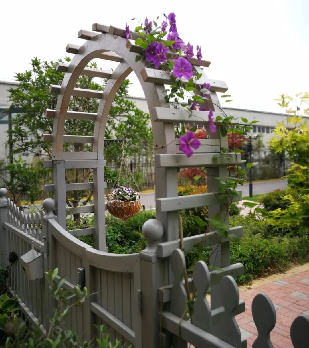 拱形大门上爬着一圈淡紫色的铁线莲,挂着一盆盛开的紫白色牵牛。夏日灼热的阳光下,一种名叫贝拉安娜的白色绣球仍然在坚强地绽放着,它比无尽夏更加耐热。