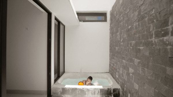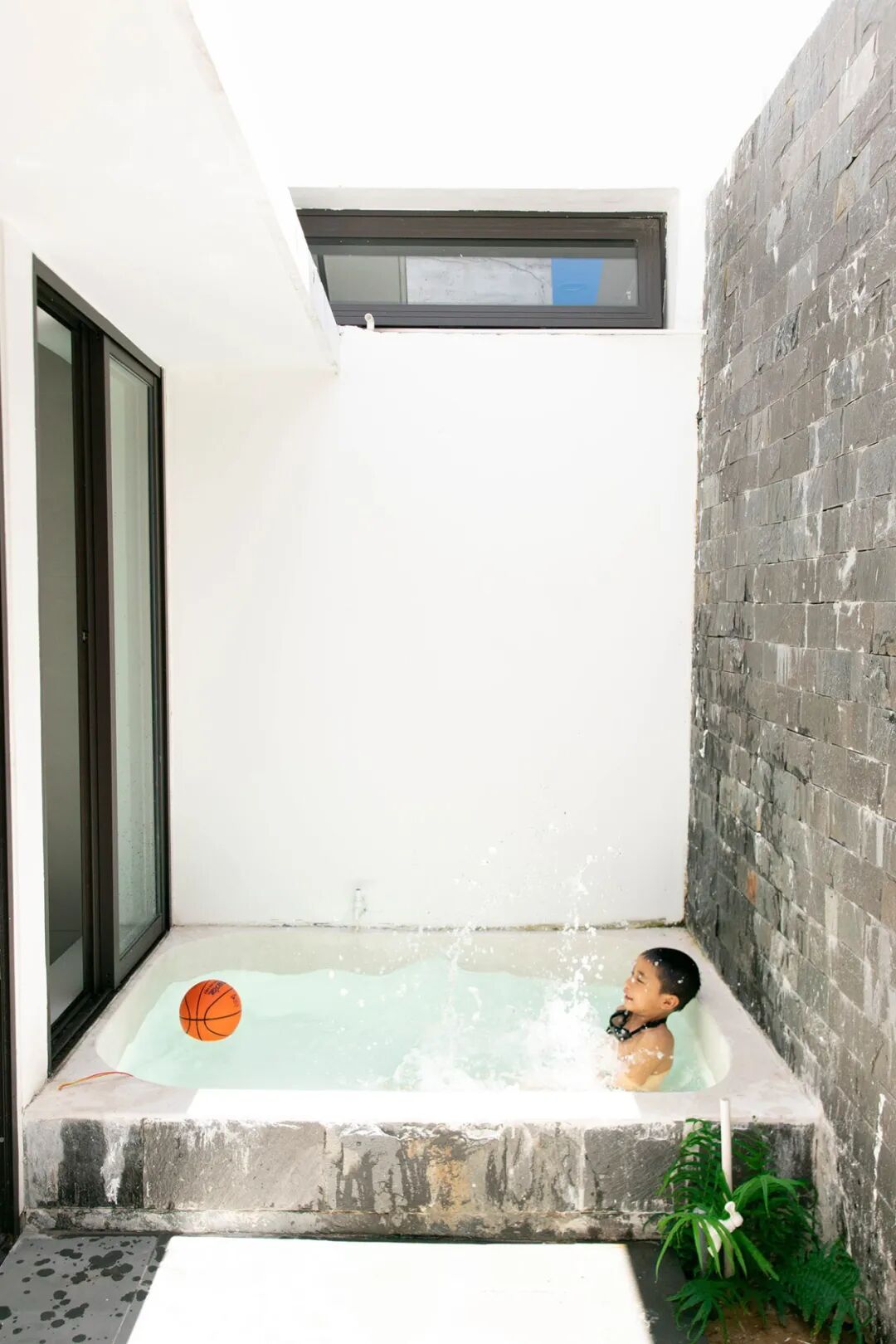 还有一个稍大的天井在主卧后方,这里一侧是小花园,一侧是露天浴池,任由孩子们玩耍。