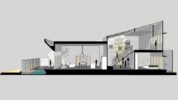 前方是公共起居空间,中间是一个“庭院”,后方则是私密的卧室空间。