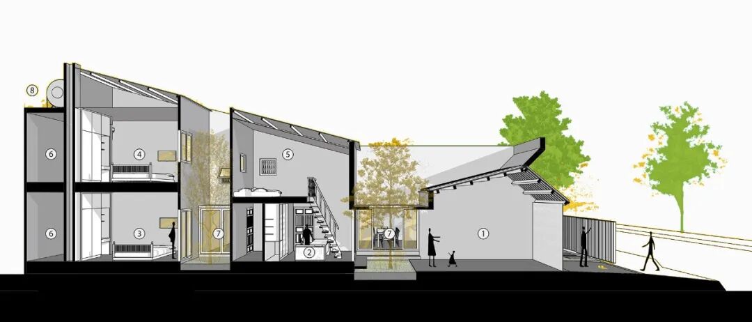 中庭作为缓冲地带,将前方家人公共活动区和后方私密休息区划分开来。