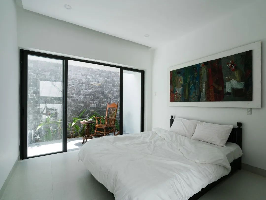 房子主色调刷成了白色,因为会安较多使用深色的木质家具,简单的白色更凸显出家具的特色。大部分的家具也是屋主自己收藏或找匠人专门定制的,材料就是本地常见的一些木材或石材。