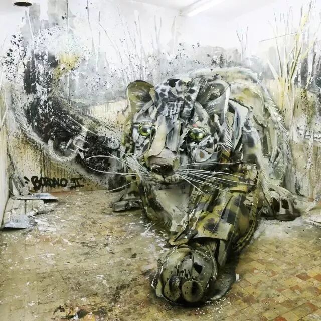 之后他就开始从街上捡垃圾,后来还去到垃圾场或者废弃的工厂里寻找原料进行动物雕塑。