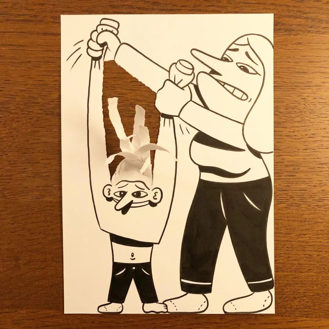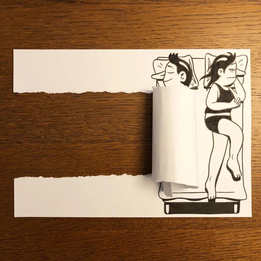 不得不说,这位艺术家让创作变成了一场游戏,有着极好的互动式体验感,仿佛赋予了纸张新的生命。他描绘了平凡生活中的2D人物,正在经历的生活场景,通过简单的撕扯与折叠,这些场景可以以3D的形式栩栩如生,趣味场景,让人看了忍不住捧腹大笑。