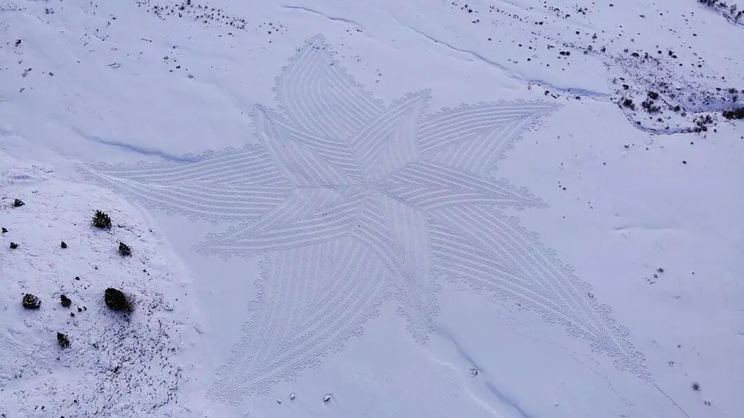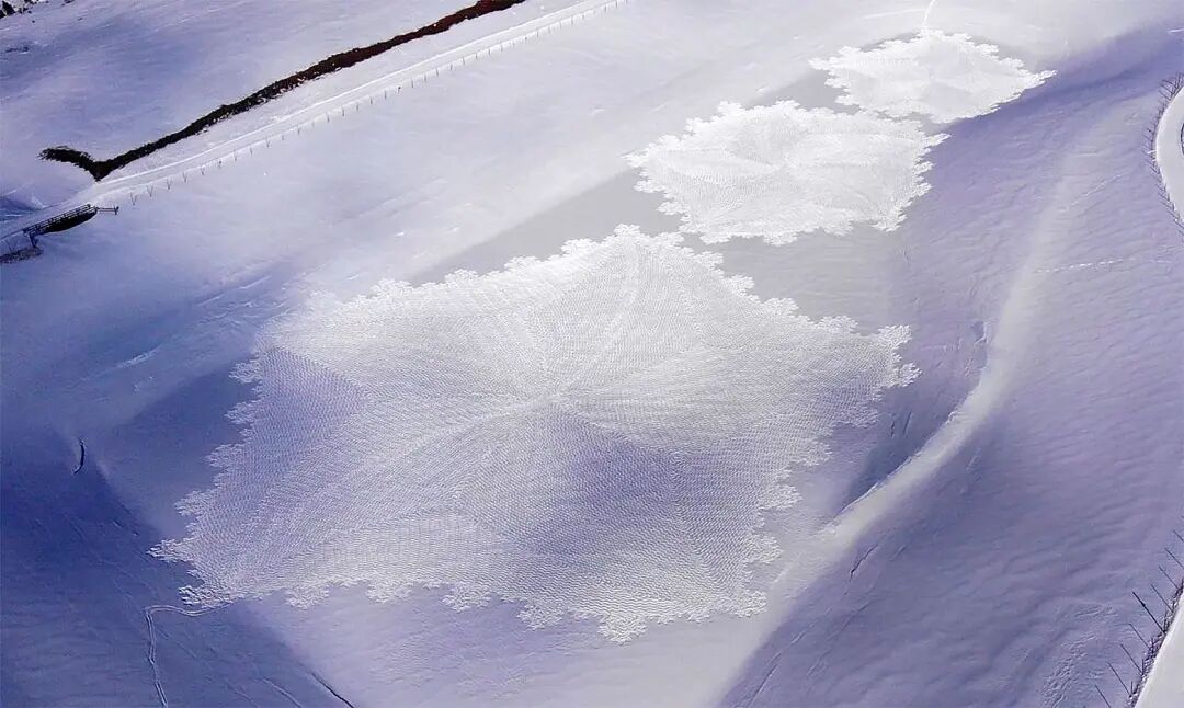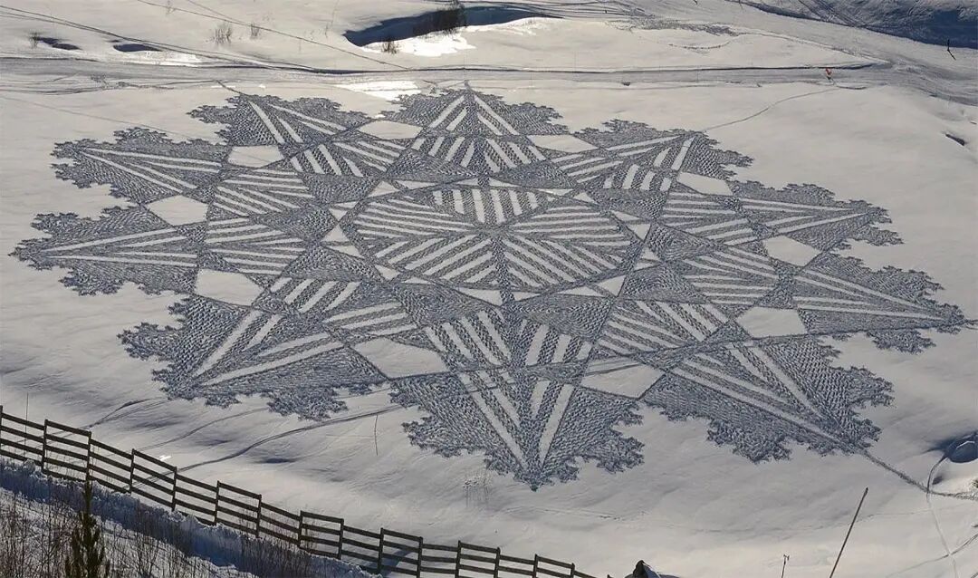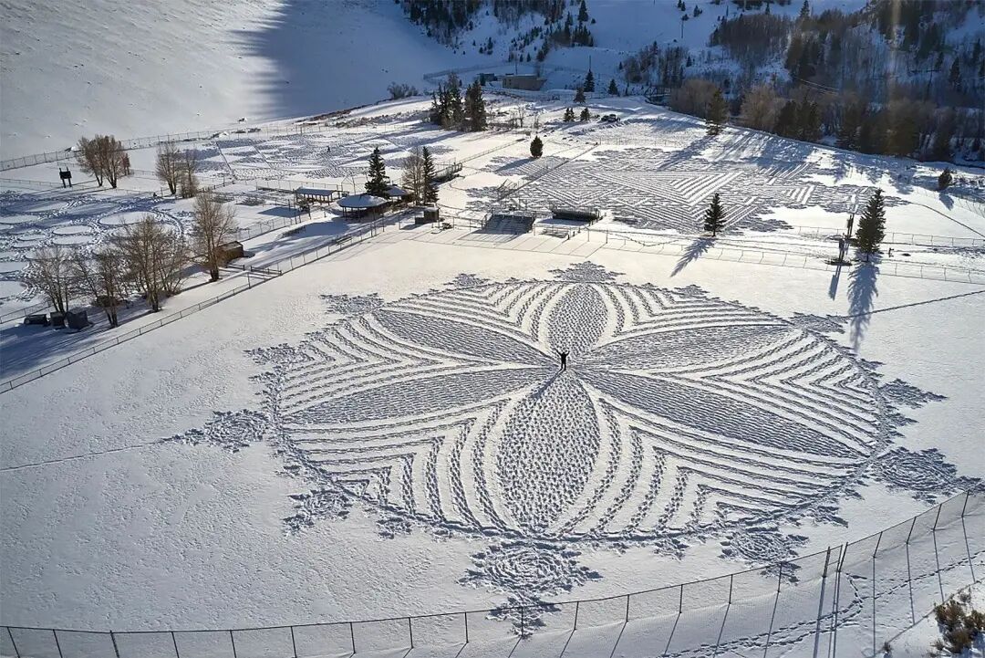 多年的创作,让这位老牌大地艺术家有了足够丰富的经验,凭借一双防滑的鞋子,他就可以在短短几天的时间里,创作出长达百米的巨型作品,在雪地里进行创作除了要抵御寒冷外,还要接受许多考验,像是第一天走过的痕迹,第二天很有可能就会被大雪和大风覆盖,就要重新开始绘制。