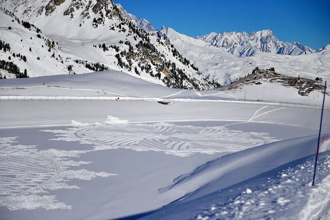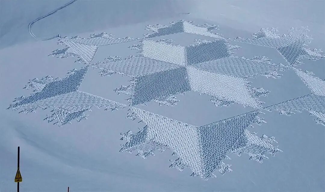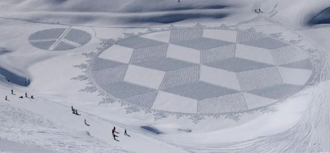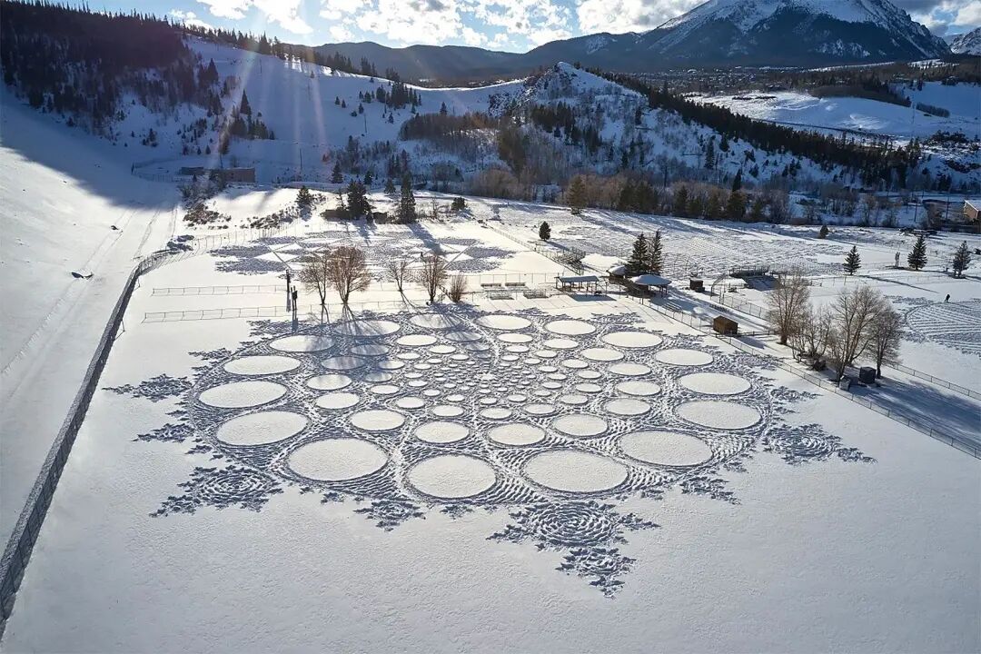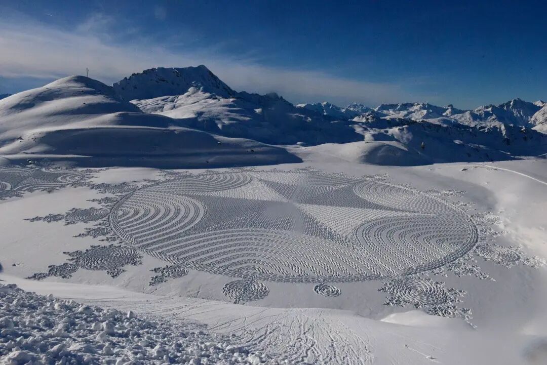 多年的创作,让这位老牌大地艺术家有了足够丰富的经验,凭借一双防滑的鞋子,他就可以在短短几天的时间里,创作出长达百米的巨型作品,在雪地里进行创作除了要抵御寒冷外,还要接受许多考验,像是第一天走过的痕迹,第二天很有可能就会被大雪和大风覆盖,就要重新开始绘制。