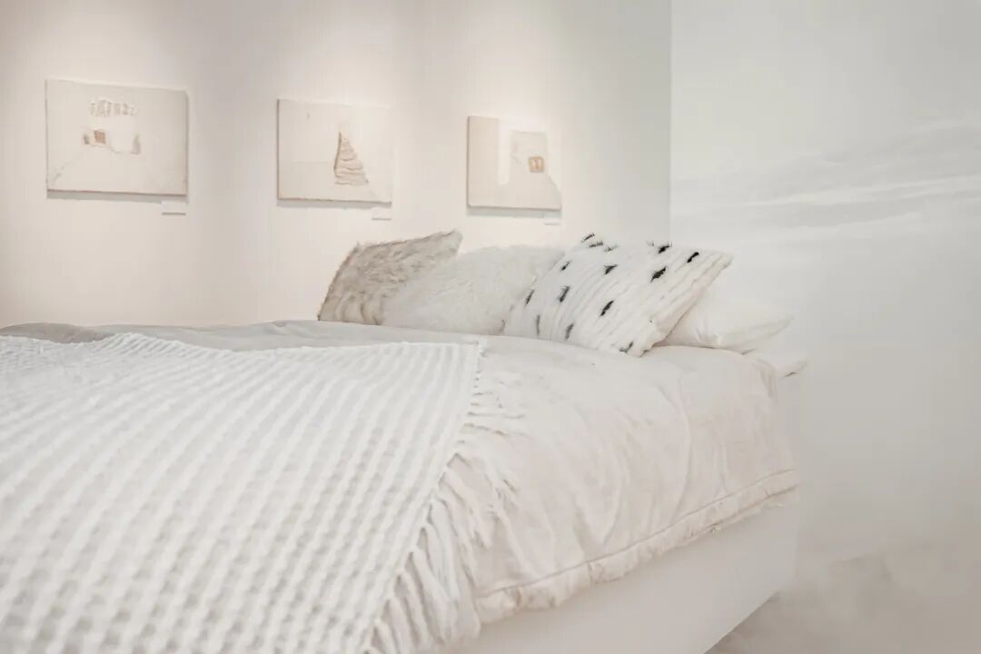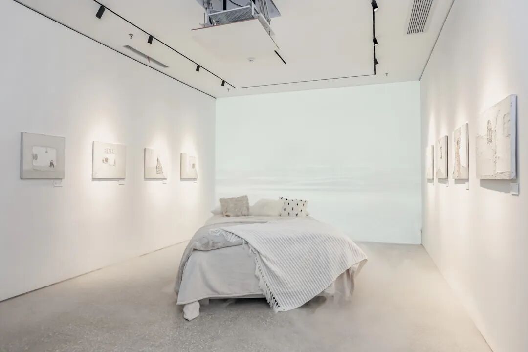在第二空间中,白色的沙岛构筑成一个个宛如云朵般的梦的载体,大尺幅的、以“整体”有关的作品在此呈现,提示观者“到达”的概念。