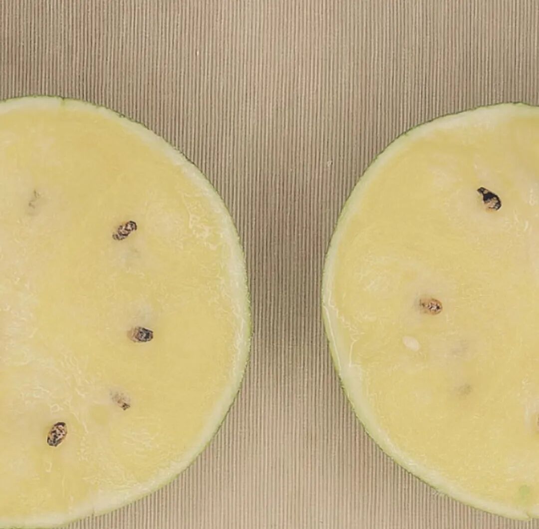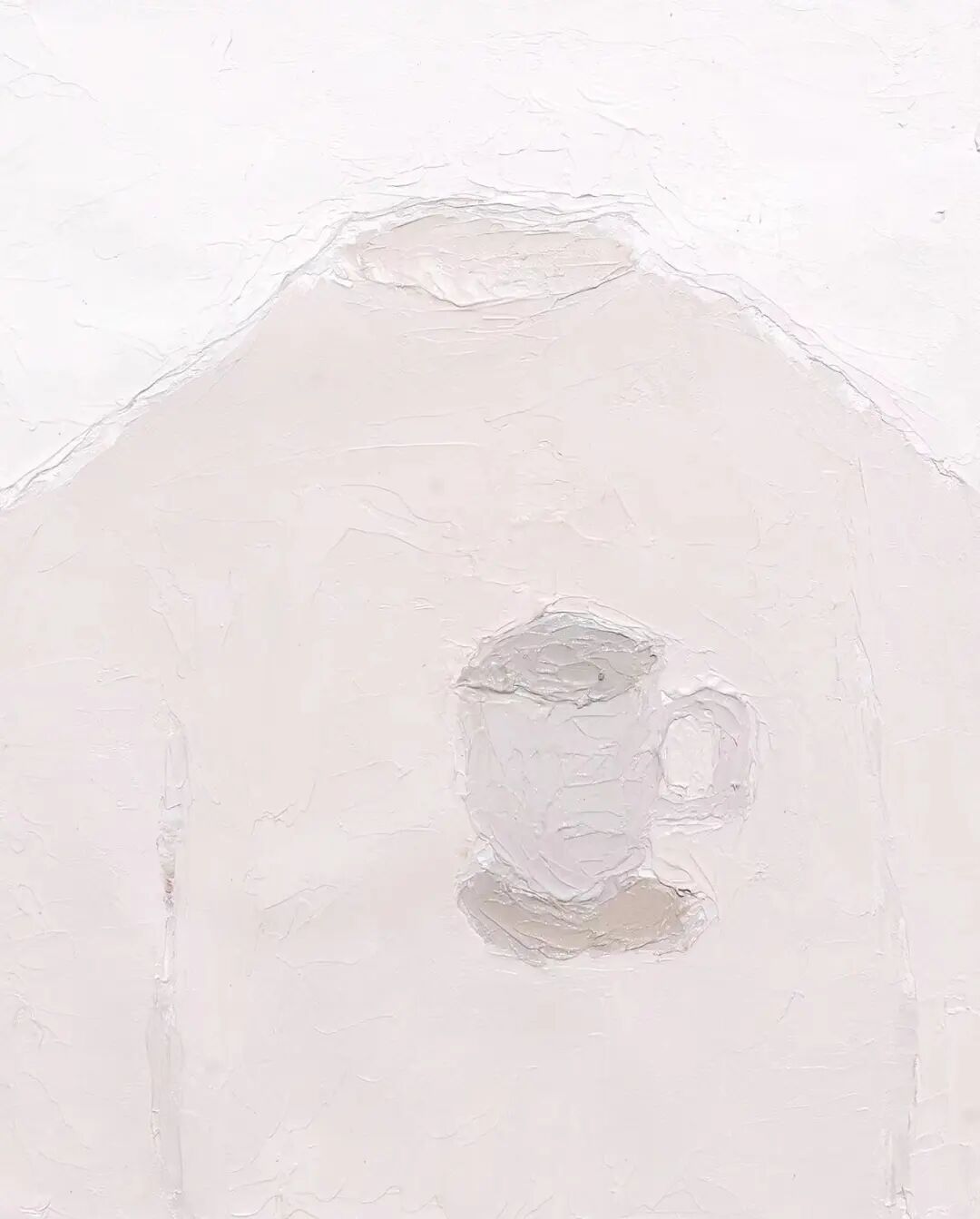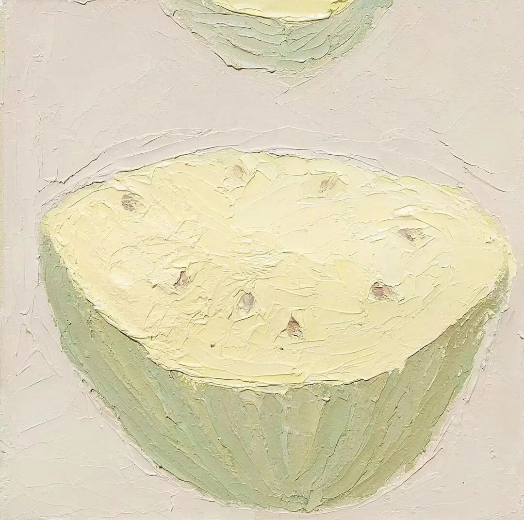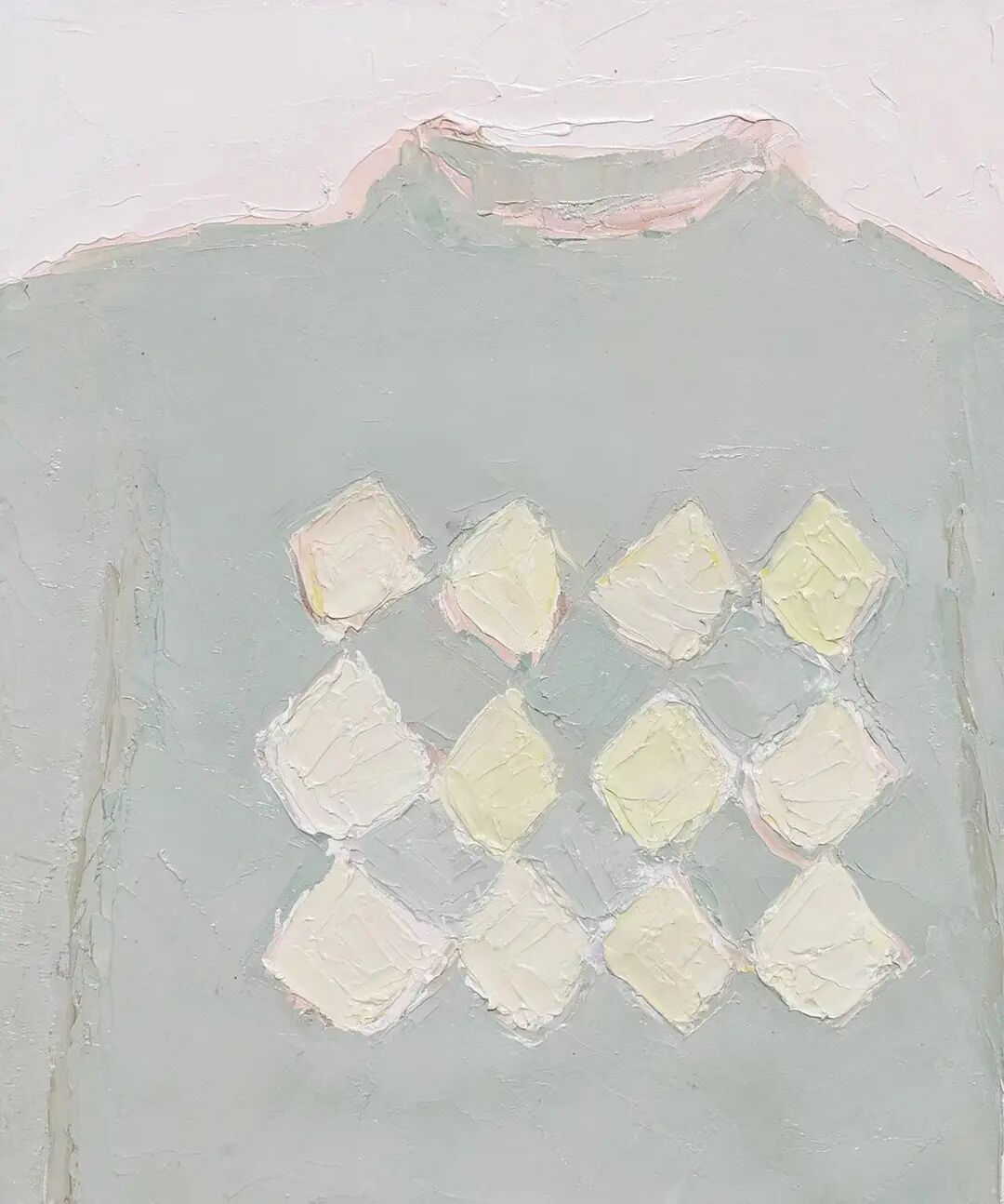 冯:我选用了些较为鲜艳的水果作为对象,可能是希望带来些被压抑久的愉悦感。在疫情最为严重的期间,想起了一件妈妈给我织的毛衣,用记忆画了一幅,家人的关心显得特别重要。另一件衣服上画了一个常用的牛奶杯,那一刻的牛奶是非常稀缺的。我还画了绿色的椅子,造型有点像绿花菜。