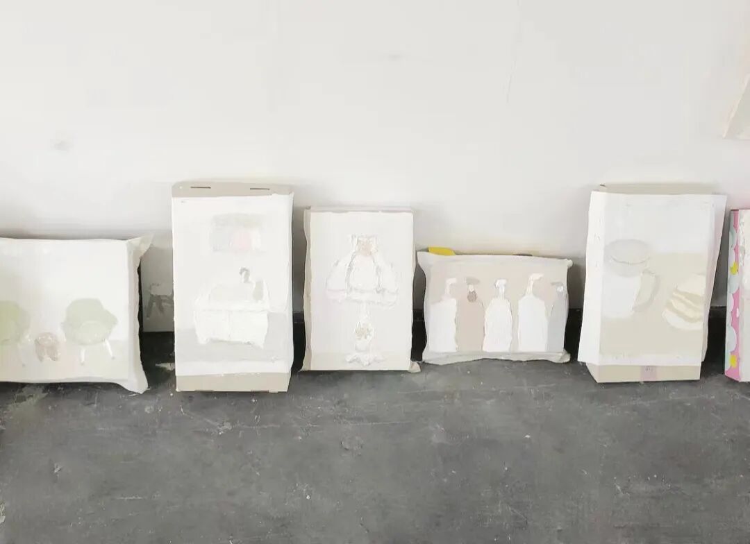 在物资稀缺的情况下,冯玮以纸箱、椅子等作为框架作画。