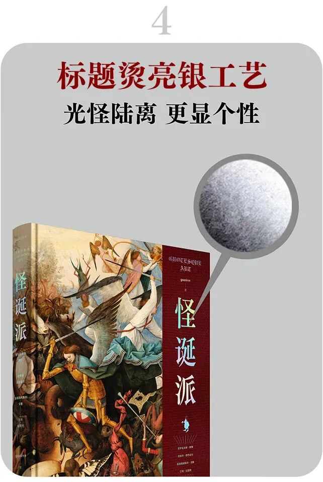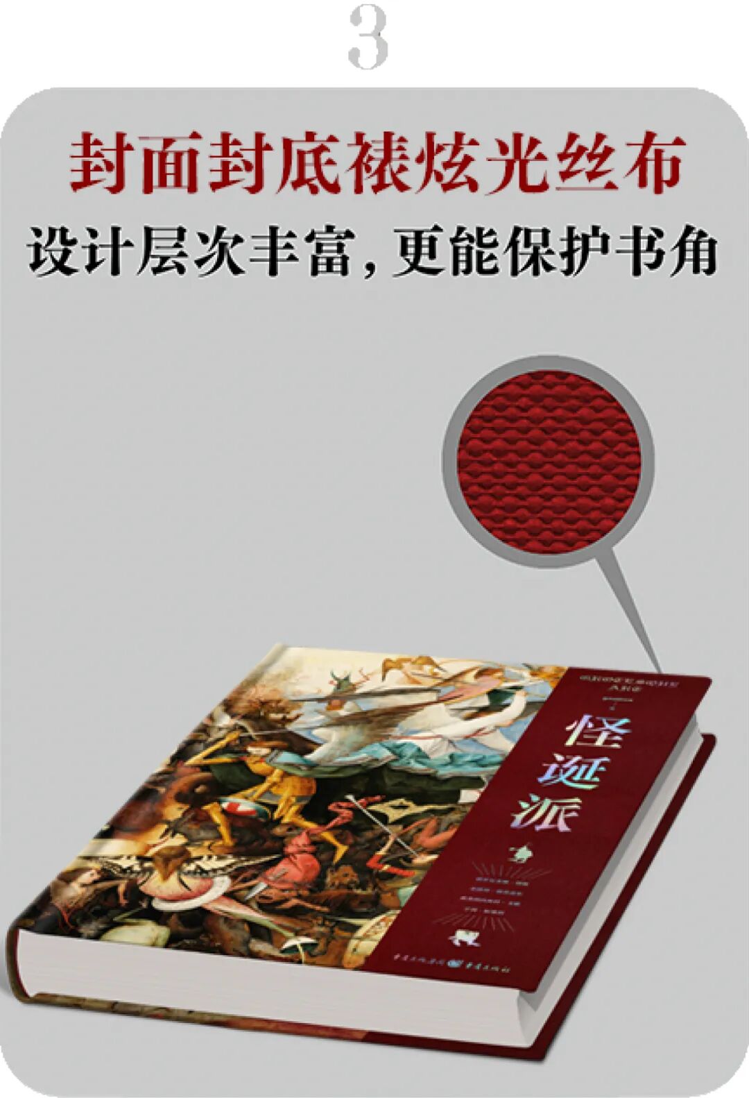 《怪诞派》采用225*300MM的大开本制作,更好地展现画作细节,带给读者更佳的视觉体验。书籍使用经典的圆籍设计,握感和档次感十足,采用紧密锁线装订,180度无障碍平放阅读。封面封底裱炫光丝布,标题采用烫银工艺彰显个性。