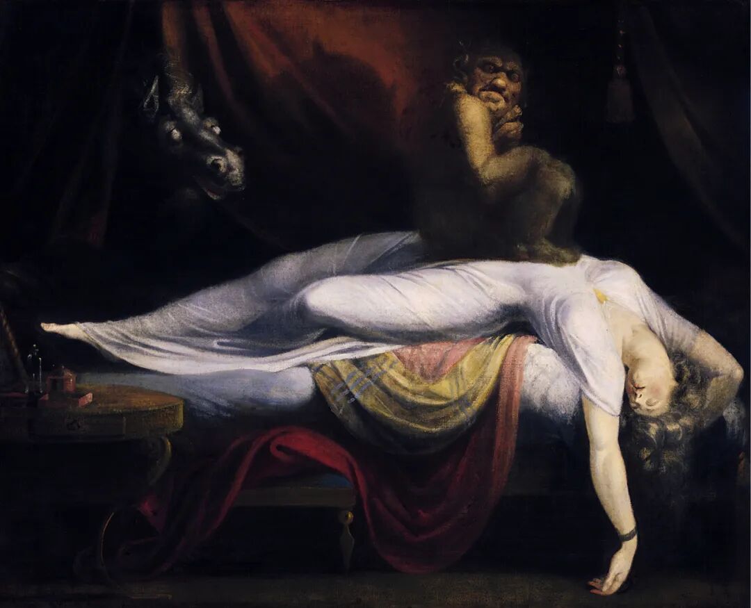 《梦魇》是福塞利的代表作,他为这个题材创作了多个版本。福塞利在这幅画里形象地再现了人做恶梦时的恐惧心境,画面上一位体形优美的女子躺在卧榻之上,头和胳膊垂在床沿边。在这位少女的胸腹之上蹲坐着一个相貌狰狞,浑身长毛的怪物,它正压制着少女的灵魂,使梦中的她惊惧恐慌。在背景处,诡异地伸进一只马头,它正从窗帘后窥视着这一场面。在英国的传说里,恶魔总骑着母马,在黑夜里呼啸奔驰。左方红色布帘探出的马头,暗示噩梦以恶魔的形象出现;妇人向下弯曲的弧线,仿佛是被梦魇捕获,呈现一种无力挣扎的状态。这幅画形象地表现出梦与现实,恐惧与欲望,优美与丑陋的强烈对比,通过细节上的具体描绘和怪诞的形象塑造,呈现出超现实的荒诞与怪异。