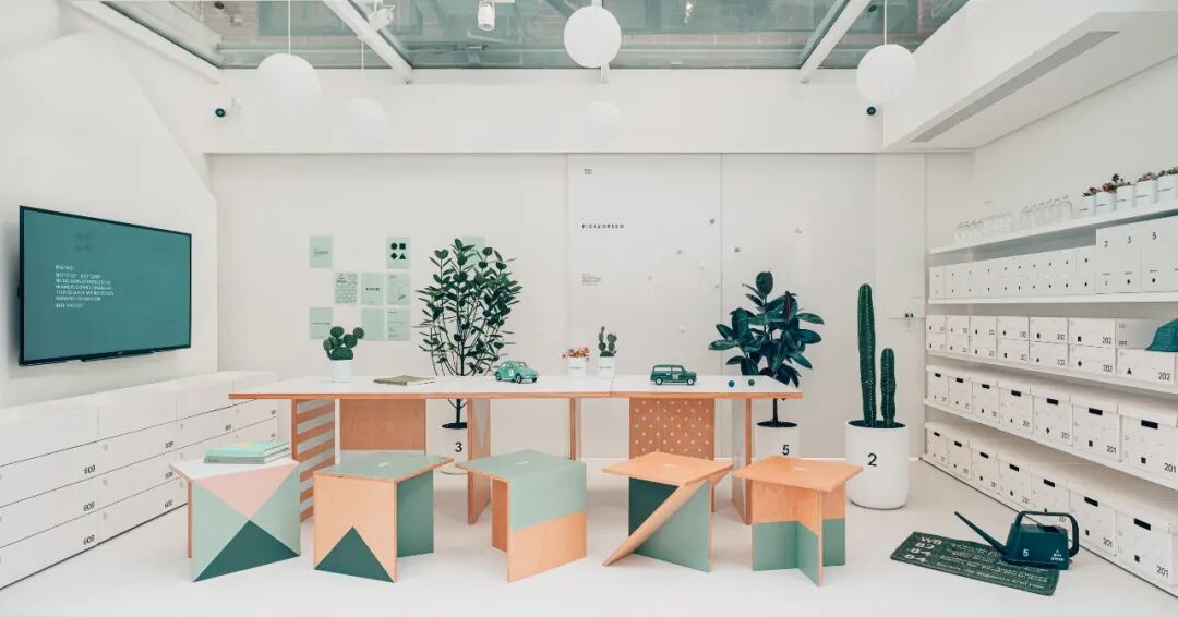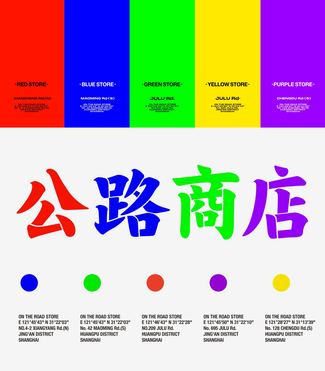 在普遍认知里,颜色被用来代表情感,红色是热情、蓝色是冷静、绿色代表和平。其实都是牵强附会,颜色就是颜色。既然我们做了一个破坏性的动作,那么我们就用一种最直接彻底的方式,把每一个店用一种最基本的方式去定义。
