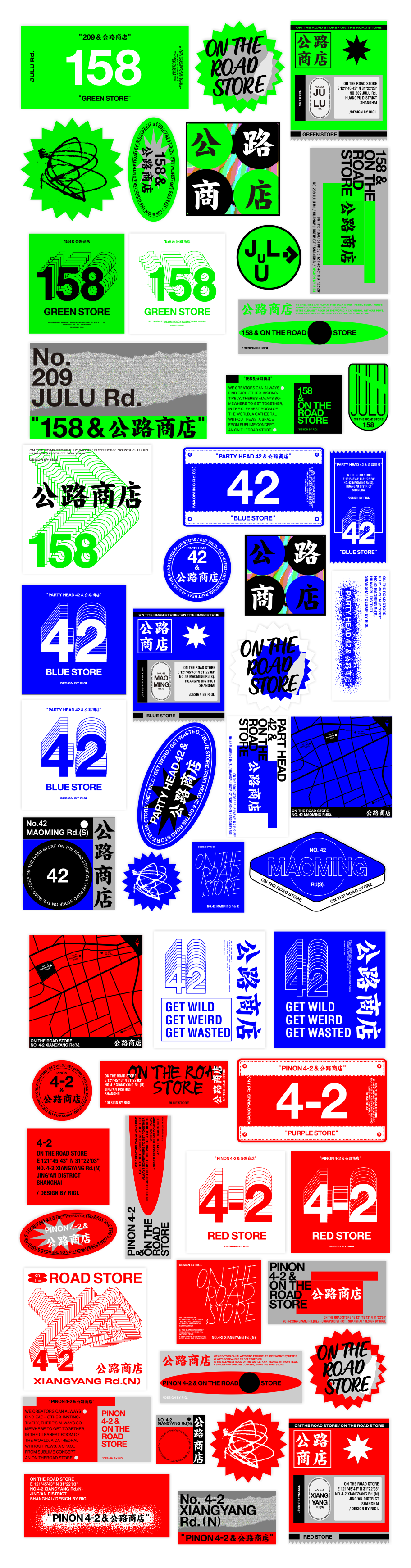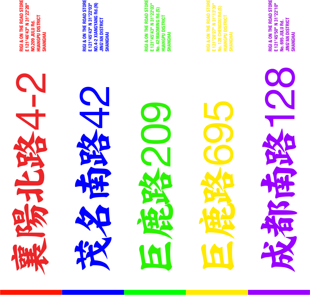 就像是动物用气味划定地盘一样,我们希望大家通过这种浓烈的介质来标识,红店,绿店……等等。在街道打上补丁,划上地盘。红绿蓝三原色汇集的无数可能。魔都巨富长上明亮的红绿蓝会天然的唤起年轻人体内的多巴胺。