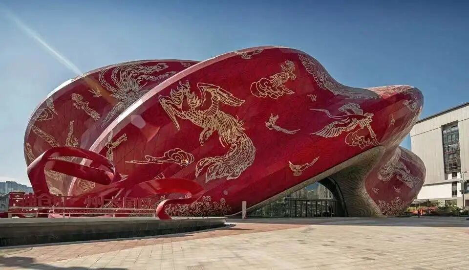 服饰也好,麻将也好,这些都算是配件,翻车之后推陈出新便是,新系列会覆盖掉旧系列。但一旦建筑翻车,就只能坚挺地在原地矗立个八百十年。例如,坐落于广州花都融创文旅城内的广州融创大剧院,据来自伦敦的设计方Steven Chilton Aechitects(史蒂文·奇尔顿建筑师事务所,简称:SCA)所说,其灵感来自于中国古代丝绸。