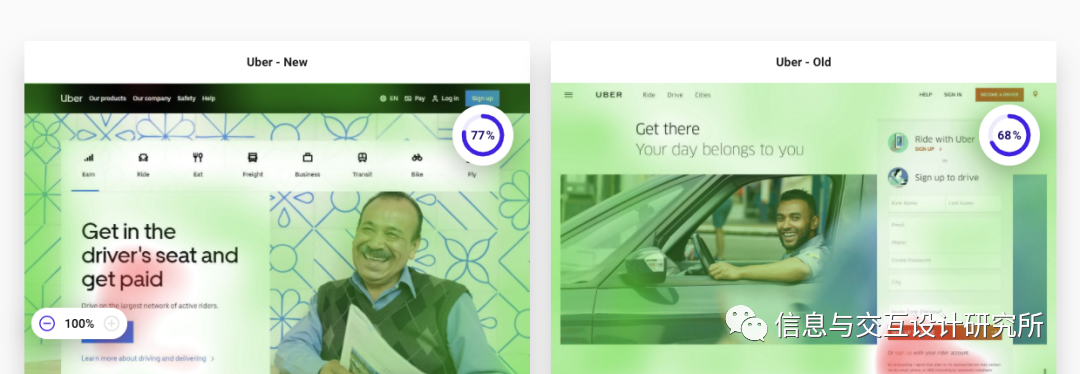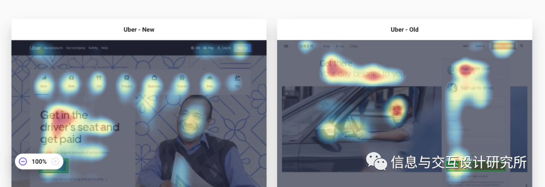从Uber官网的迭代版本可以看出,New界面的视觉层次明确,能聚焦关键信息,符合用户操作的流程。因此用户的平均注意力从2.86s提升到4.41s。