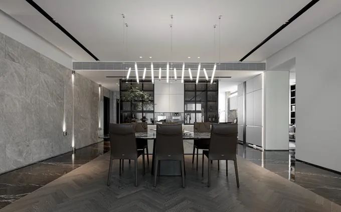 餐厅客厅开放式的设计手法融入空间当中的精致感,大理是元素的增加展示了空间当中的轻奢性,又可以体现空间当中的层次和纹理。绿植的搭配透露出东方美学的手法,又展示出家的舒适与温馨。