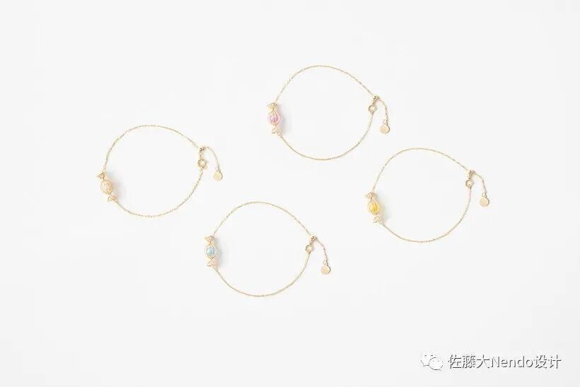 该系列提供三种“包装糖果”:项链、手镯和一套耳环,以及四种“棒棒糖”(外加一枚戒指)。包装和礼品袋的设计与图形图案制作的主题通常用于廉价的糖果包装,然而他们的压花金属抛光进一步加强了豪华设计和日常物品的双重性。