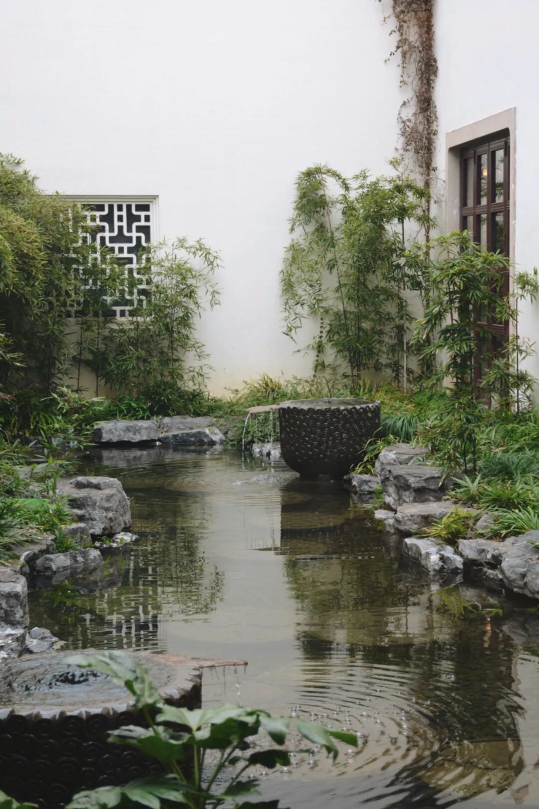 说是喷泉,其实更如同大堂正中的一方水池,是对江南民居中天井设计的致敬。