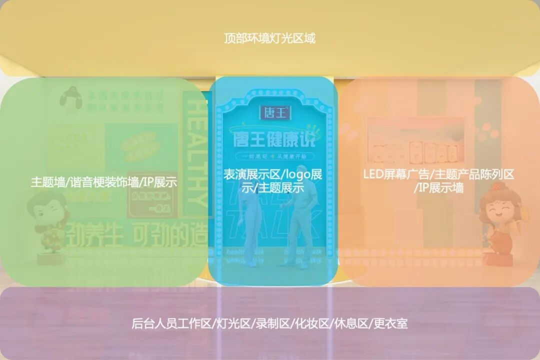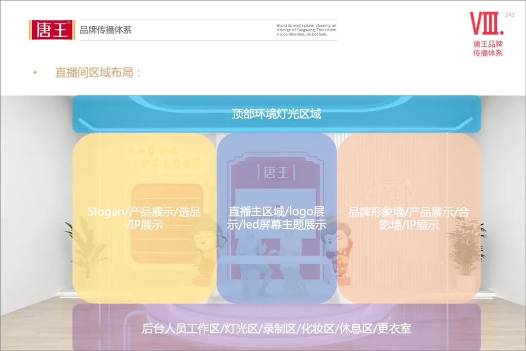 除了视觉风格之外,空间的各个道具摆放及空间布局、灯光、材质等,我们都进行了详细的说明和规划,方便未来唐王直播间的建立。