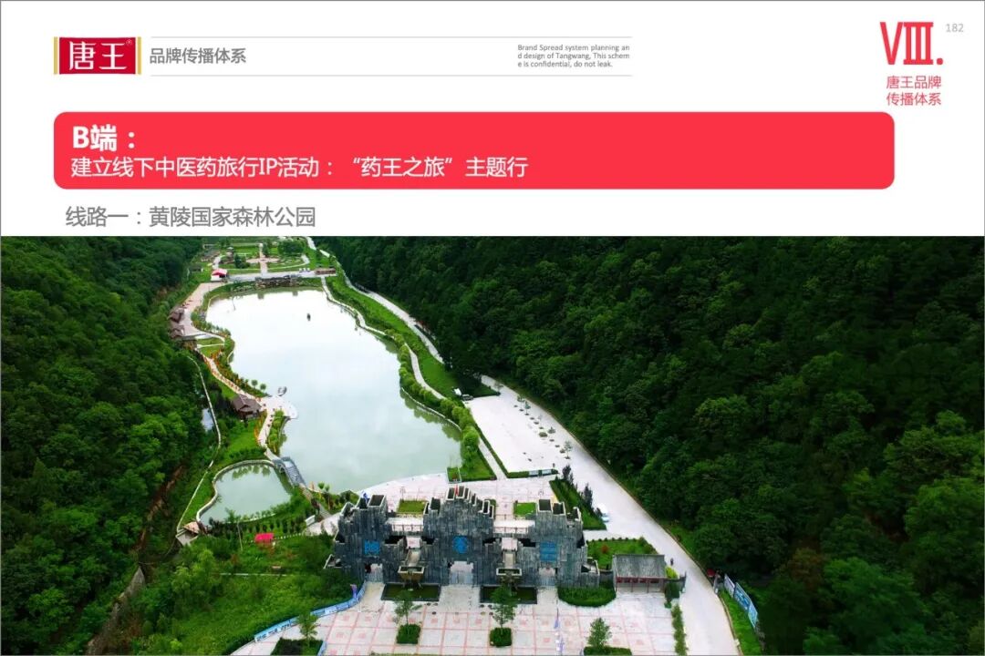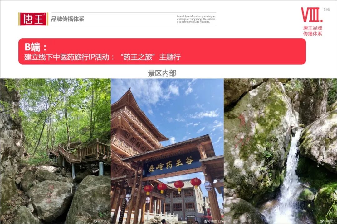 线路二:陕西秦岭药王谷。药王谷风景区位于陕西省太白县鹦鸽镇柴胡山村,是一座自然天成的药物宝库,相传为药王孙思邈在太白山的隐居研修之地。药王形象及历史文化,是唐王文化中的核心渊源,通过药王之旅,加深品牌文化内涵的认知!