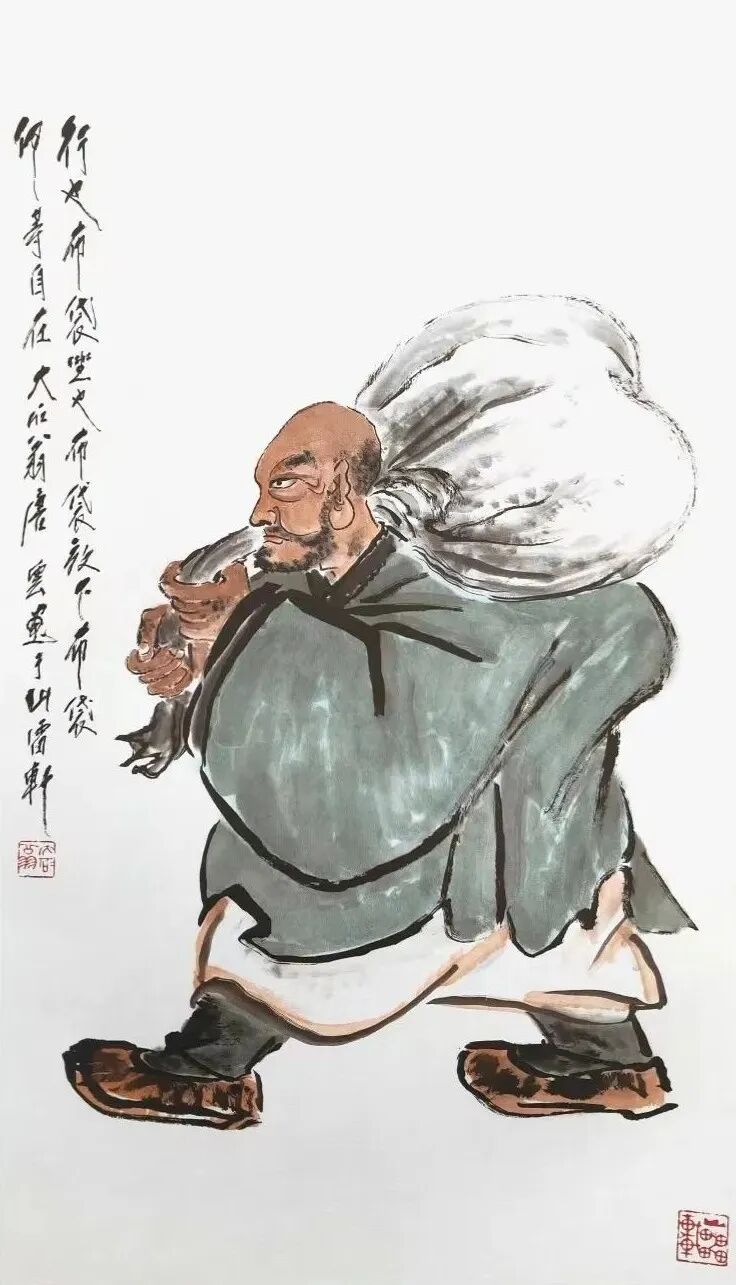 唐云先生人物画画得不多,却颇有特色,尤其是他画的钟馗、达摩、弥陀等道释人物,既有陈洪绶、金冬心、任伯年独特简约的造型,又有齐白石生辣拙趣的风味,无论是造型、笔墨,还是线条、着色均别具一格,有着强烈的个人风貌。他画的钟馗、面壁罗汉有着红衣或绿衣的,而且多置身于山林丘壑之中,风格多样,笔墨精致。他画的布袋和尚更具特色,宋人梁楷也曾作布袋和尚,肥胖的和尚捧腹而坐。而先生笔下的布袋和尚却是位瘦小的老僧,肩上背着个大布袋,踽踽而行,独创的脸部造型,宽大的中式外衣,用笔生拙,着色雅致,笔简神完,颇有禅意。