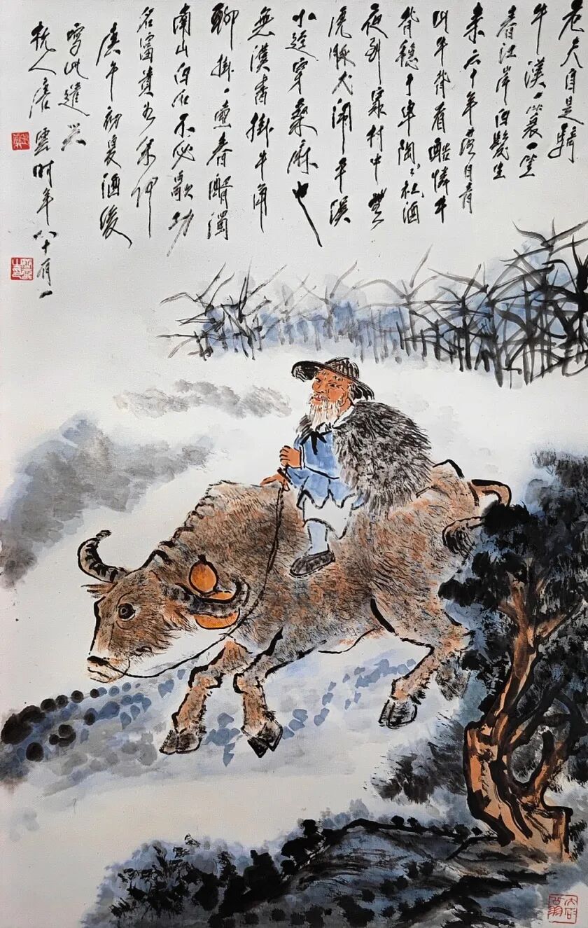 《老夫骑牛图》是先生在八十一岁时所画,画上的题词是:老夫自是骑牛汉,一簑一笠春江岸,白发生来六十年,落日青山牛背看,酷憐牛背稳于车,陶陶社酒夜到家,村中无虎豚犬闹,平溪小径穿桑麻,也无汉书挂牛角,聊挂一壶春醑濁,南山白石不必歌,功名富贵如余何。庚午初夏,酒后写此遗兴。杭人唐云时年八十有一。画的正中是一位悠闲的老翁身披簑衣,头戴斗笠,骑在一头肥硕的水牛背上,一手牵牛绳,一手扶牛背,神态自然生动,那水牛步履稳健,眼睛紧盯前方,画面一下就抓住观者的眼球,右下角仅画了一棵老树及一个斜坡,用笔老辣生拙,右上角是一片竹林,画的极简极虚,中间加上一些若有若无的苔点,将晚归的景色描绘的如真似幻。画的上面是先生用独特的唐体书法题写的他自作的词句,错落有致,一气呵成。其实这是一幅集人物、山水、花鸟、走兽、书法与一体的画,绝非一般画家所能为,正体现出他是近现代当之无愧的诗书画全能型杰出画家。仔细阅读他的题词,一位勤劳聪明的老者,穿行于平溪小径之中,聊挂一壶春醑濁,陶然自乐,功名富贵如余何的悠然之态浮现眼前,这不正是老师的自我写照吗?
