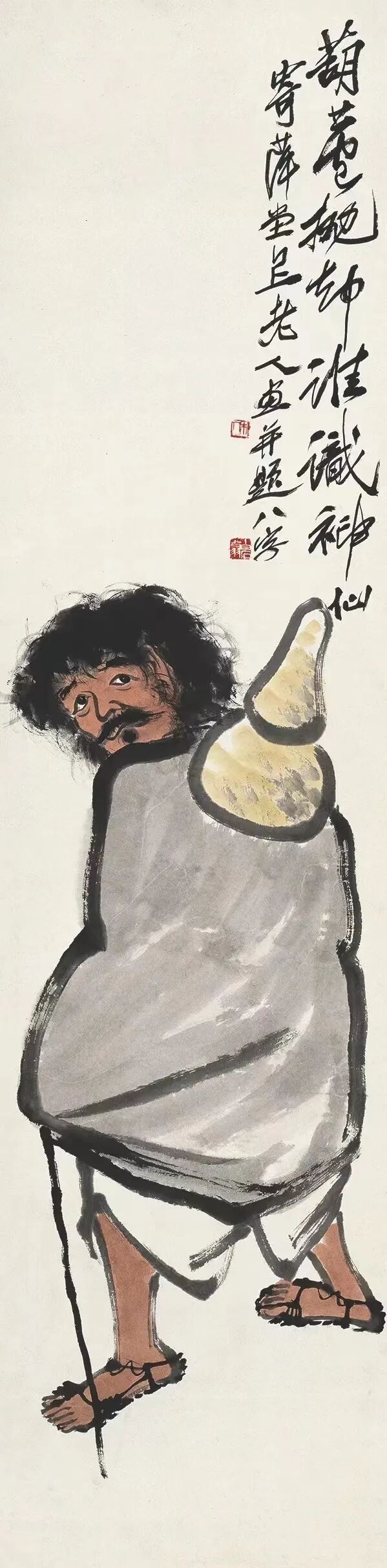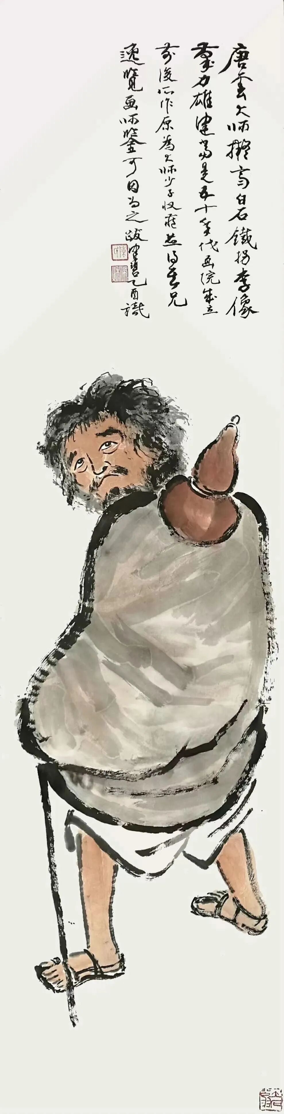 这幅画非但临得像,而且临得更神,仙人铁拐李的精气神都跃然纸上,尤其是脸部的表情、头发的笔触、衣纹的处理都有过人之处,特别是对背上的酒葫芦作了一个小小的更改,按了一个小葫芦盖,更具有生活情趣。五十多年之后,当这幅画展现在沪上大家陈佩秋先生眼前时,陈先生连连称好,并欣然题字:唐云大师拟齐白石铁拐李像,笔力雄健。