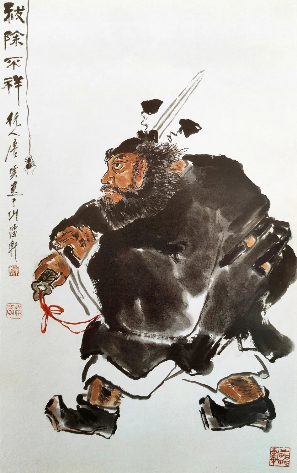 我曾见到过先生画《袚除不祥》图人物画的全过程,现摘录如下:先生用碳笔先勾出钟馗的轮廓,然后用小笔浓墨画出脸部,又用中笔画胡须、帽子、手和握着的宝剑、腰带及鞋子等,待墨色略干后,先生用大笔舔水蘸墨,在碟子上稍加调整后,即大笔挥洒,写出钟馗大块浓淡相间的墨色衣纹,趁湿又勾出衣服和裤子的轮廓,最后才给脸、手和脚上色,上色的浓淡都紧扣人物的结构,顿时钟馗的形象栩栩如生,最后才是落款,款落好后,先生突然换了一支细长的毛笔,蘸墨后在落款的右边从上往下画了一条一波三折的线,当我不明就理时,先生拿了一支小笔,画了个活灵活现的蜘蛛,那钟馗的眼睛正紧盯着它,一幅独特的《祓除不祥》图就这样诞生了。唐云先生画的人物画都是自己融会贯通后的独创,从没看到他画的人物画,有临仿某家的具体画作,而唯独一幅传世的人物画——《铁拐李》,却是完全临写齐白石先生的。