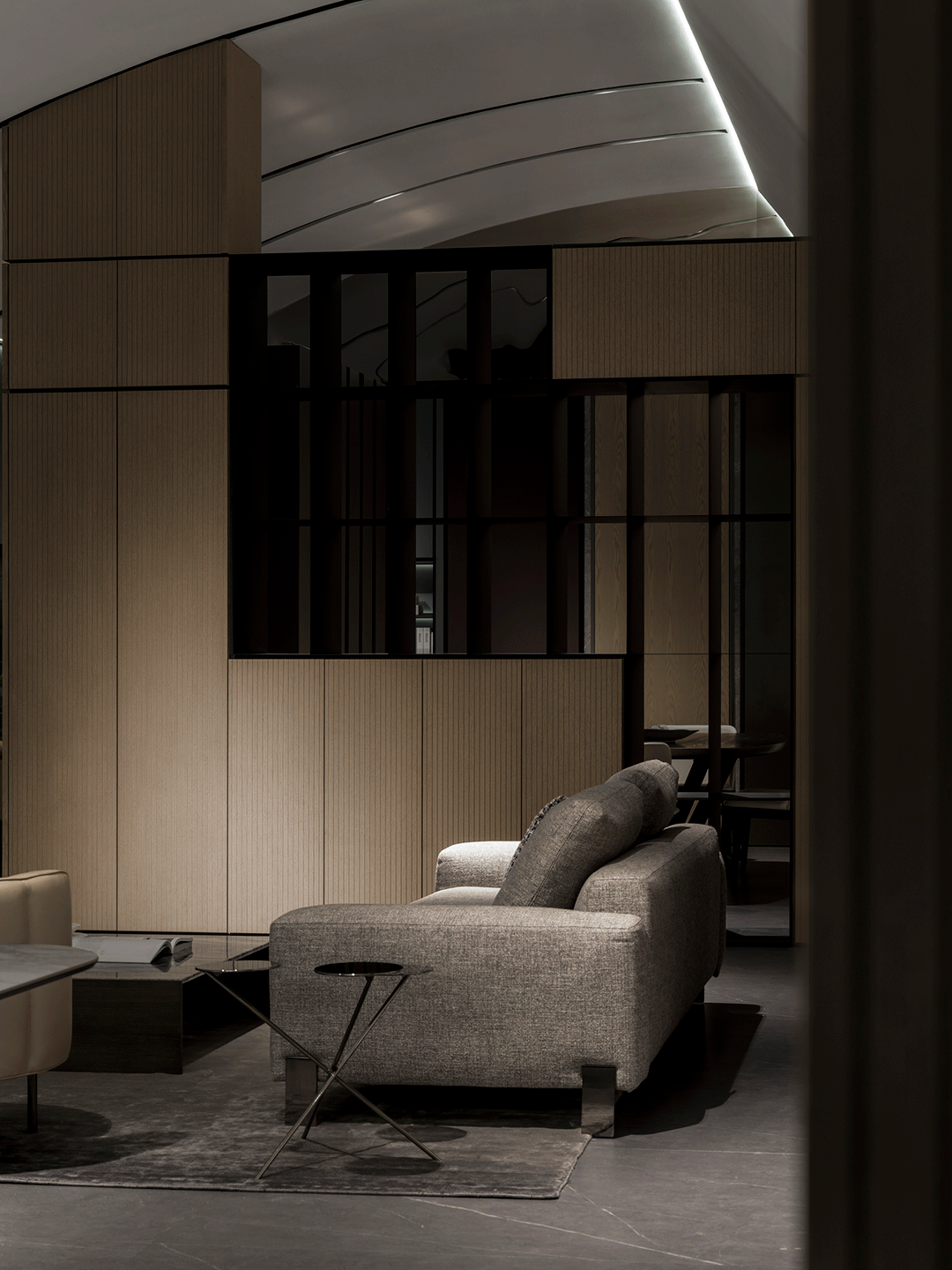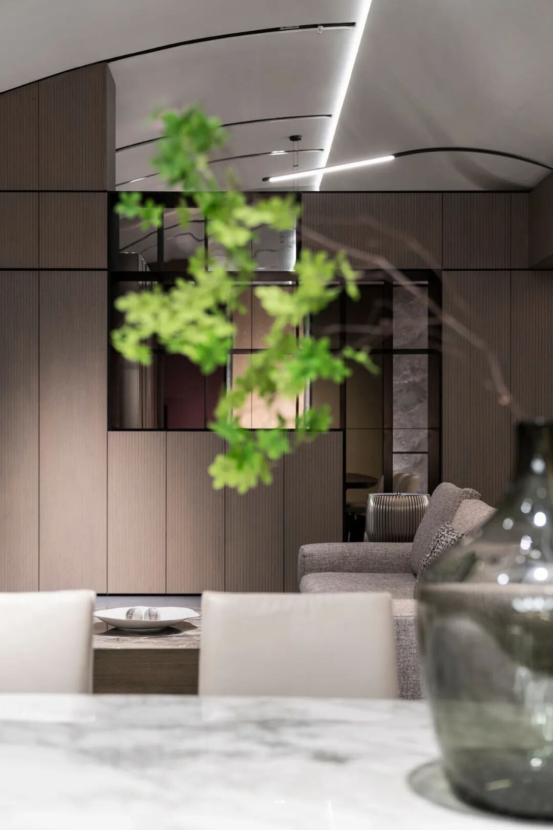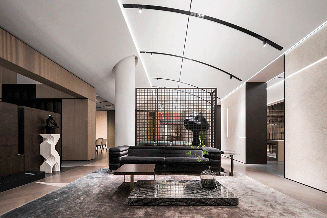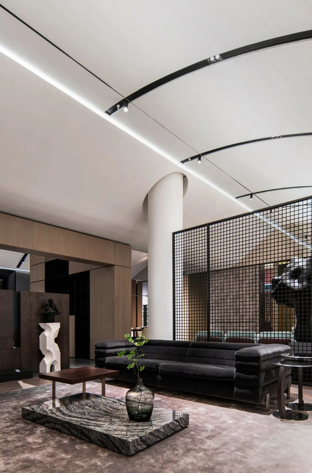 同时搭配精巧的金属构件、陈列的艺术装置、镂空格栅、深色沙发、纹理地毯,星罗其中的绿植,串连起每一个的功能场景特色。