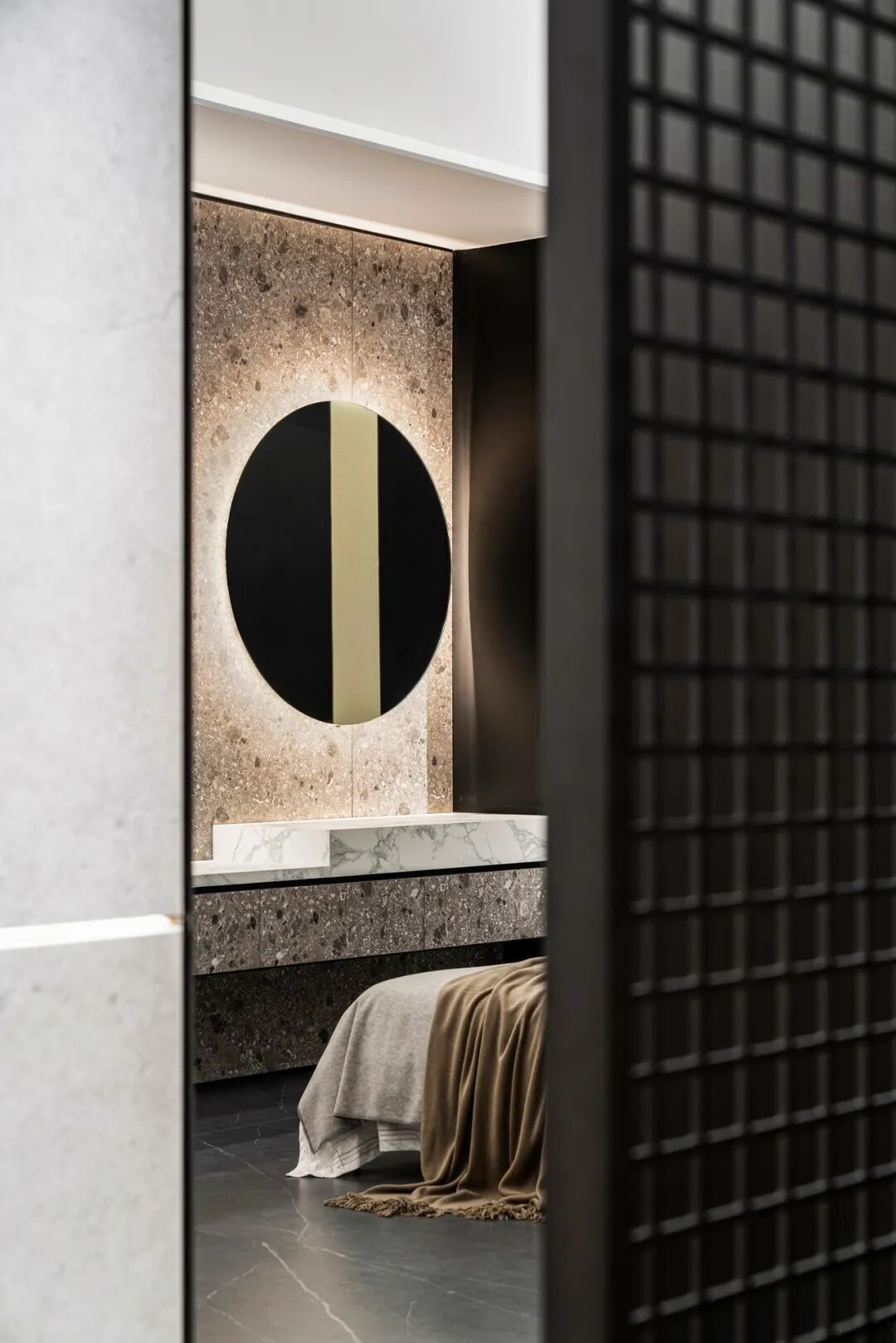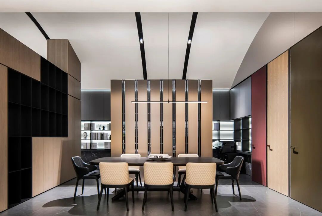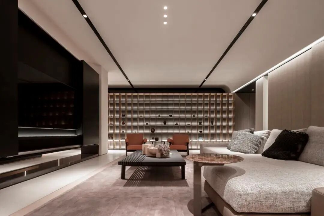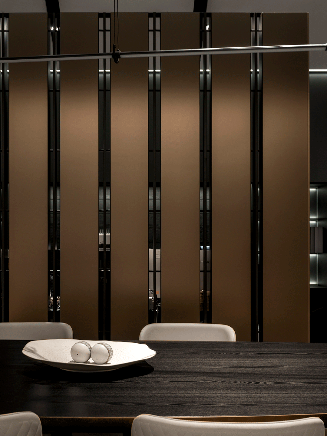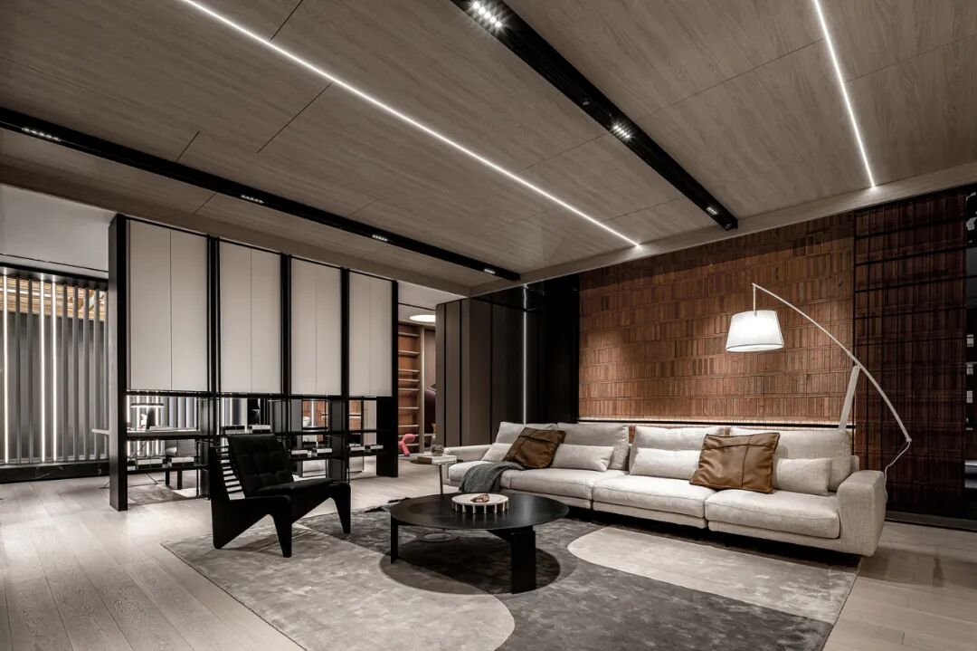 同时搭配精巧的金属构件、陈列的艺术装置、镂空格栅、深色沙发、纹理地毯,星罗其中的绿植,串连起每一个的功能场景特色。